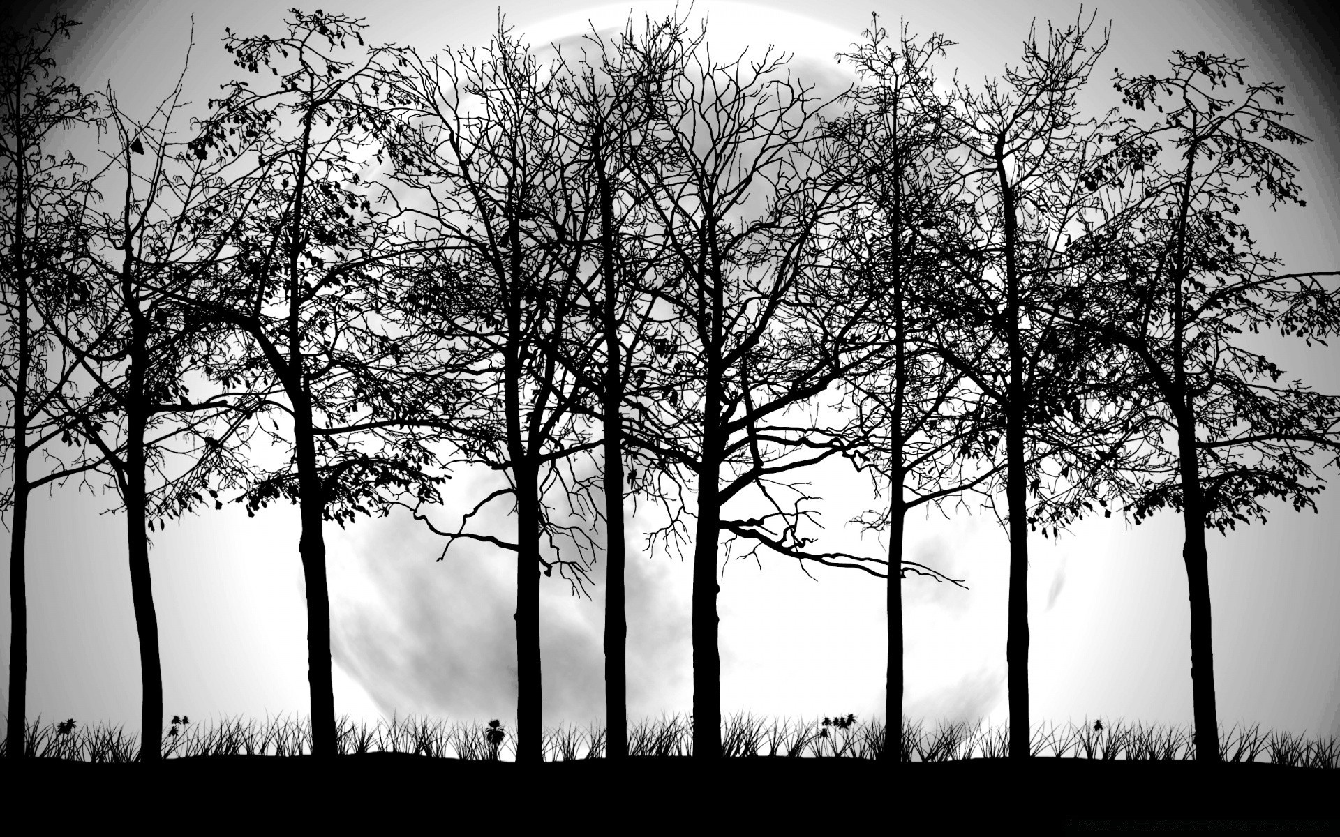 Pełnia księżyca. Nagie drzewa na tle pełni księżyca. Grafik. Czarno-biały