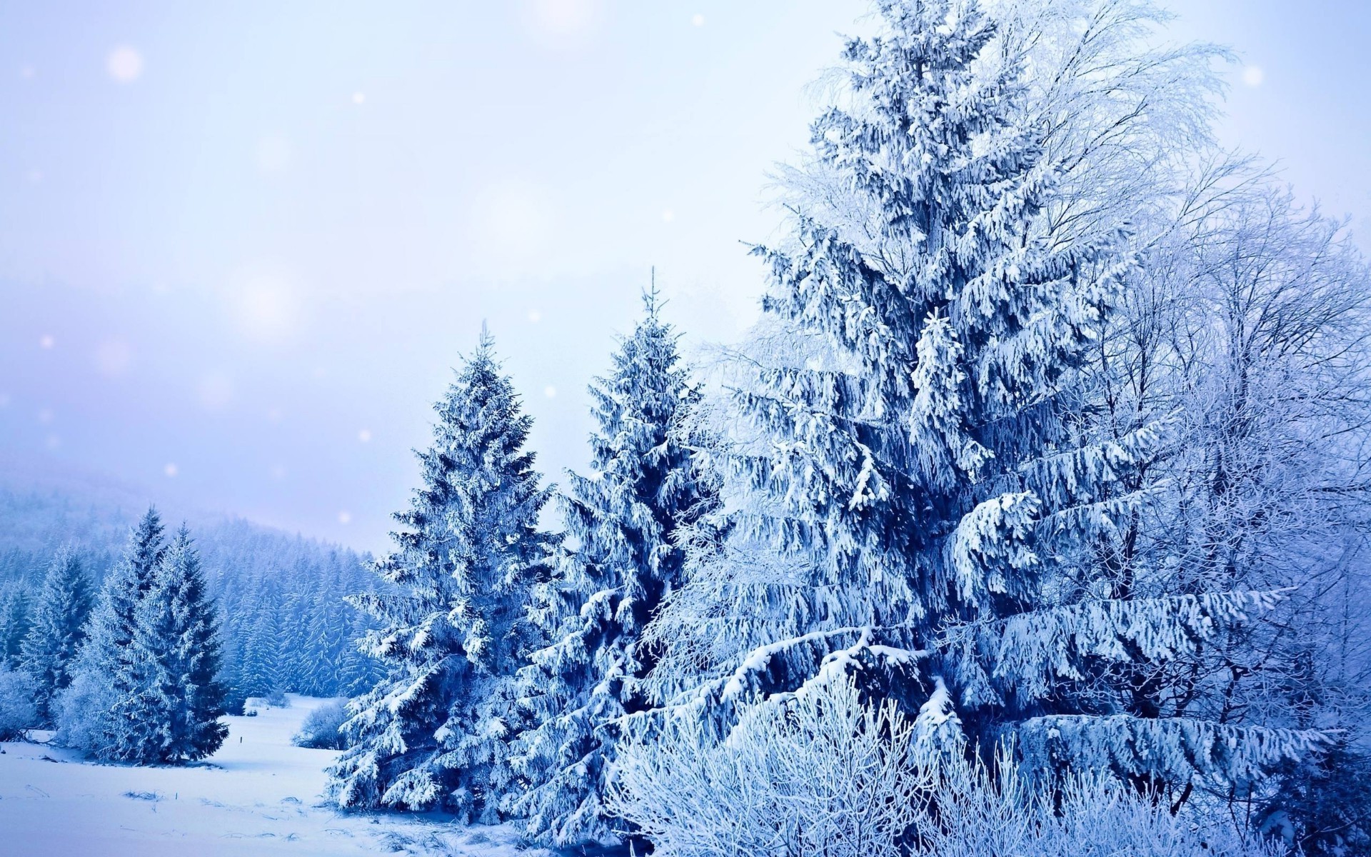 Biały bałwan w niebieskim ubraniu obok białego jelenia i białych niebieskich kulek i płatków śniegu