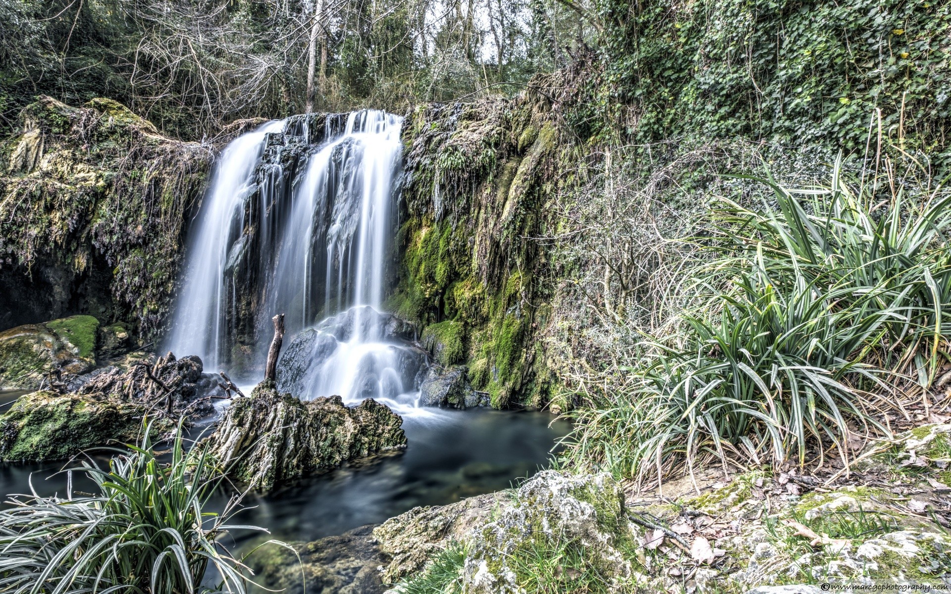 Dzika przyroda. Zielone góry i Wodospad na tle błękitnego nieba
