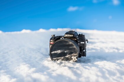 Kamera na tle nieba w śniegu