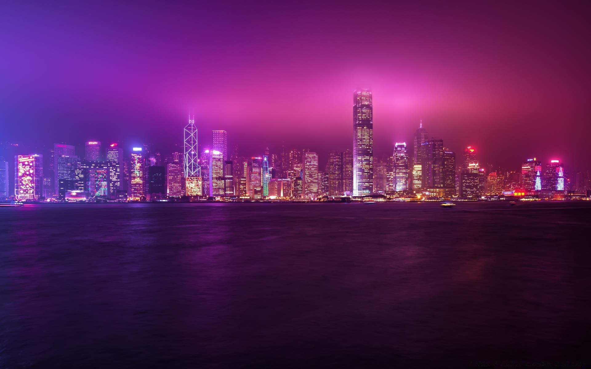Zachód słońca tonie za ciągiem drapaczy chmur