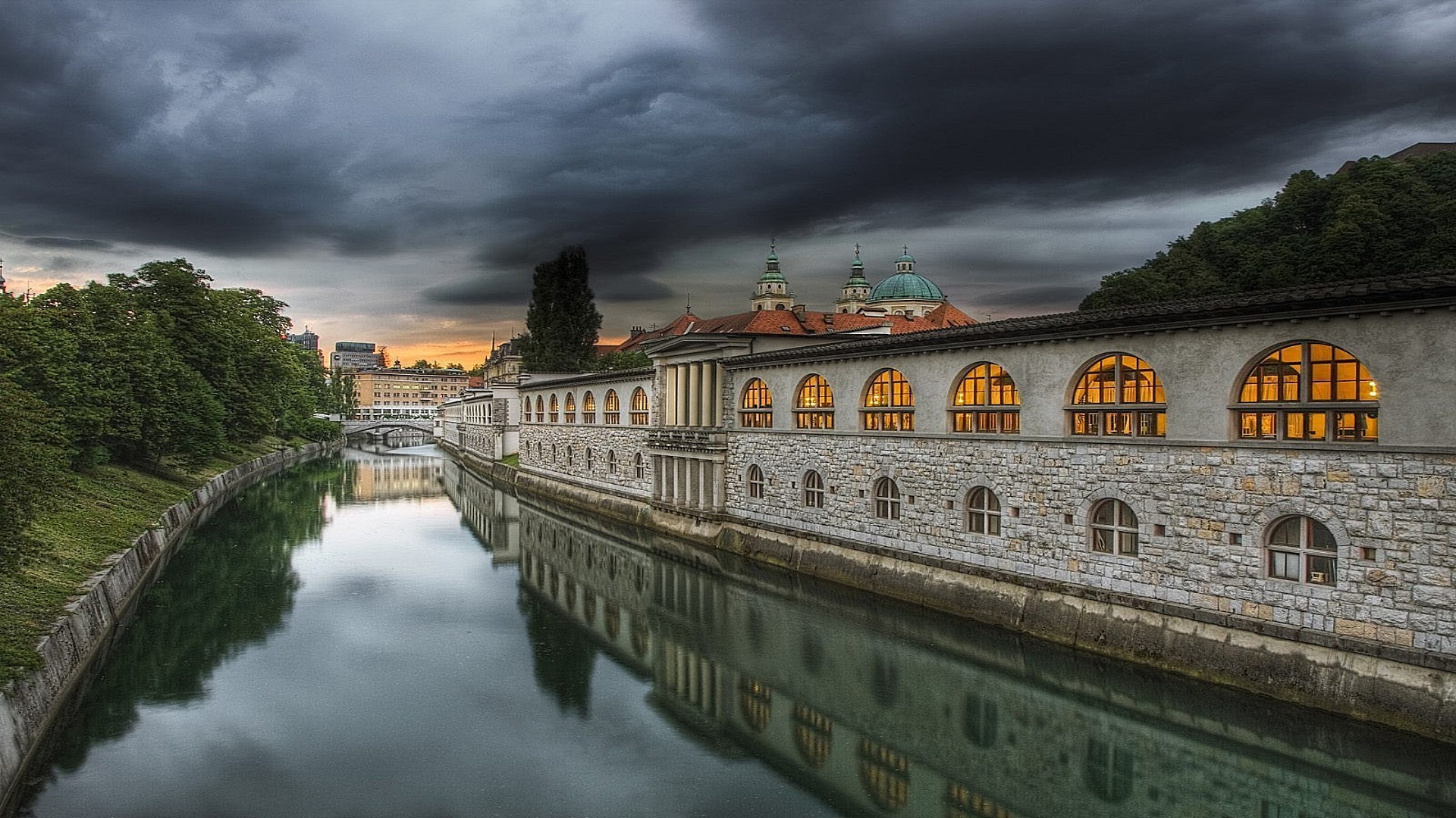 Architektura miasta o zachodzie słońca. odbicie nieba w wodzie podczas podróży