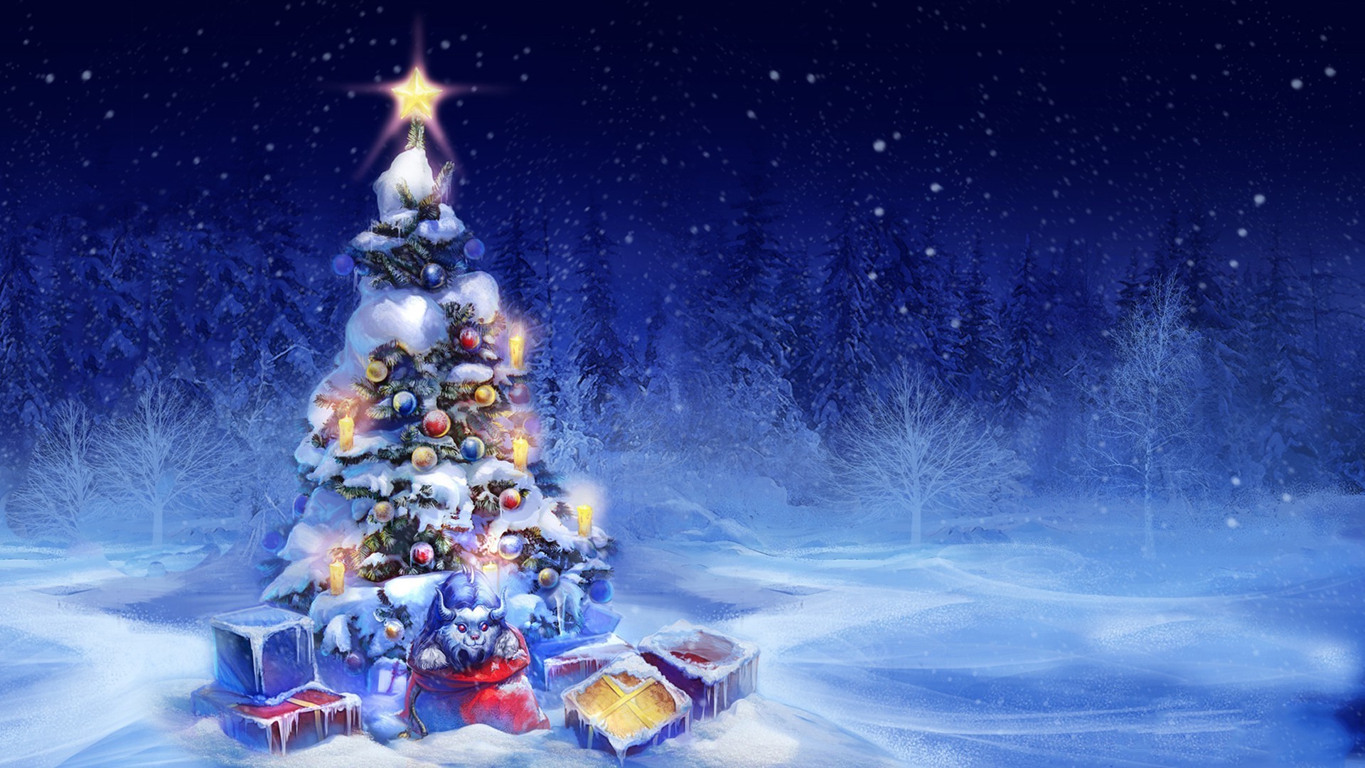 Ozdobiona choinka z girlandą Na zewnątrz w zimie
