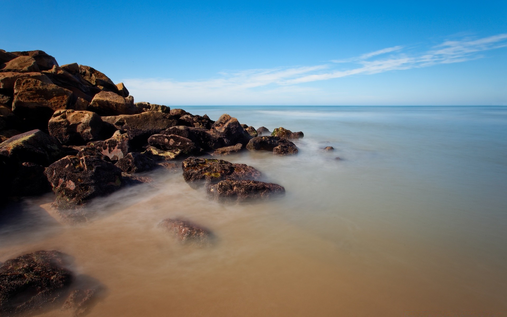 Spokojna woda morska przy skalistym brzegu pod błękitnym niebem