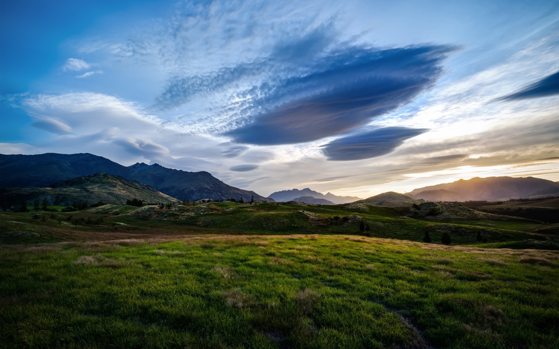 Krajobraz z ciemnymi chmurami i zielonym polem