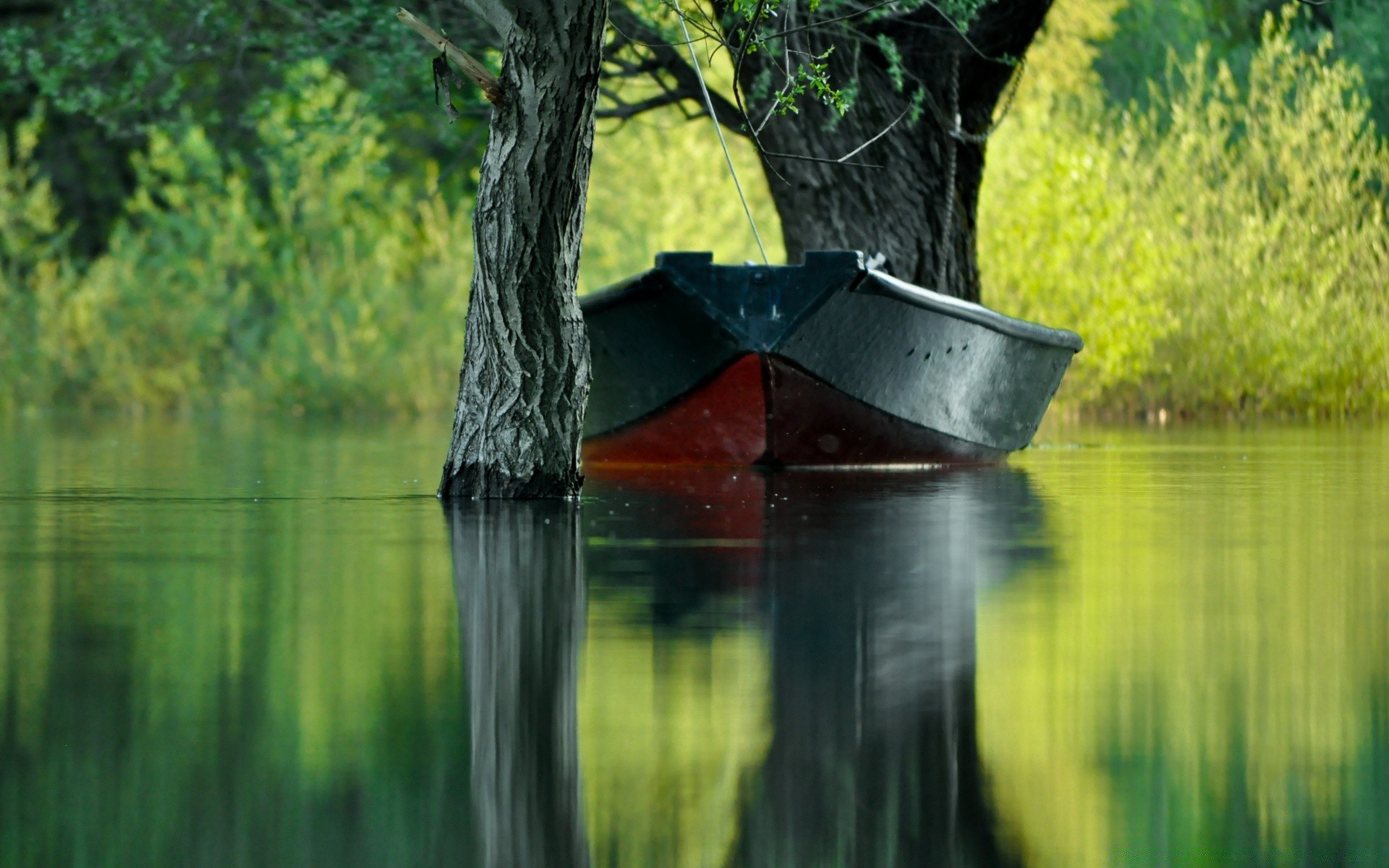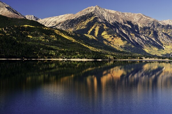 Piękne jezioro odzwierciedla góry i czyste niebo