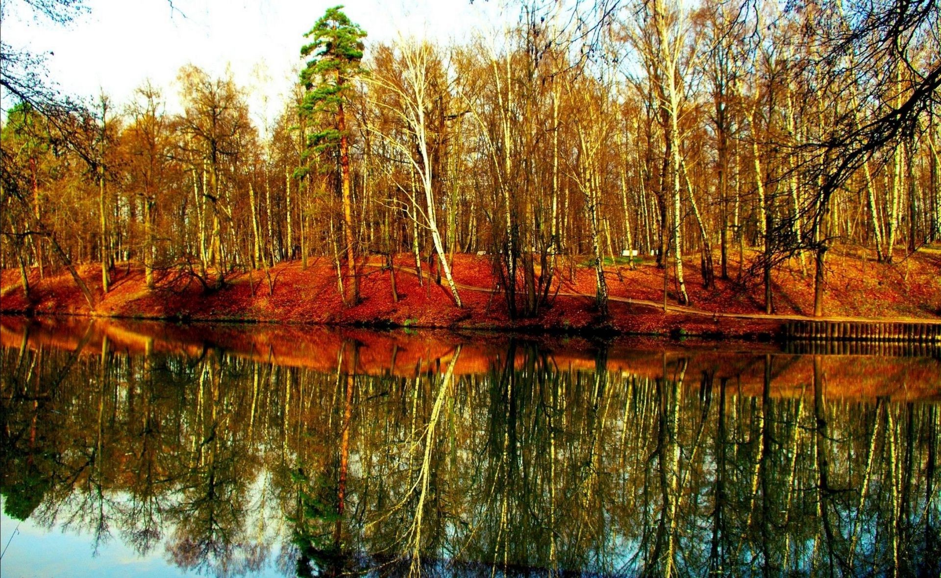 Fascynujący krajobraz jezioro o zachodzie słońca wokół klifu