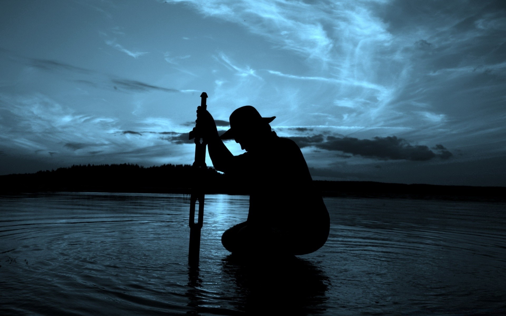 Sylwetka mężczyzny w kapeluszu na tle wody i niebaSylwetka mężczyzny w kapeluszu na tle wody i nieba