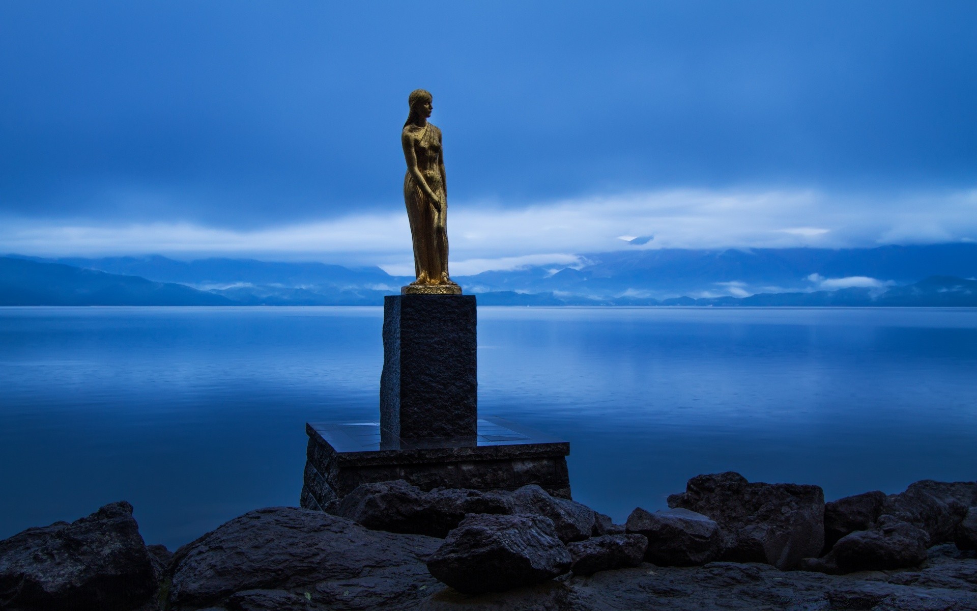 Posąg na tle błękitnej wody i nieba