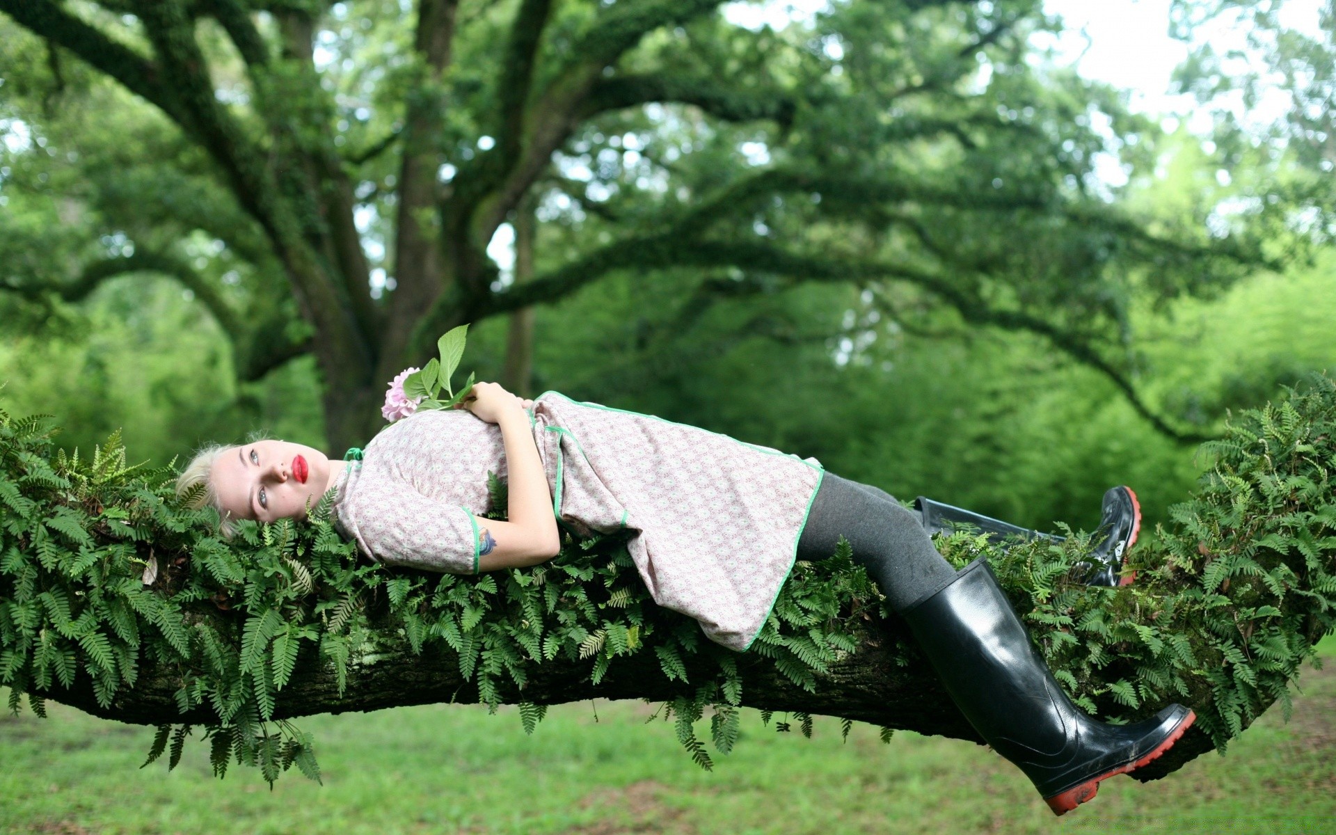 Dziewczyna leży na zielonej gałęzi drzewa