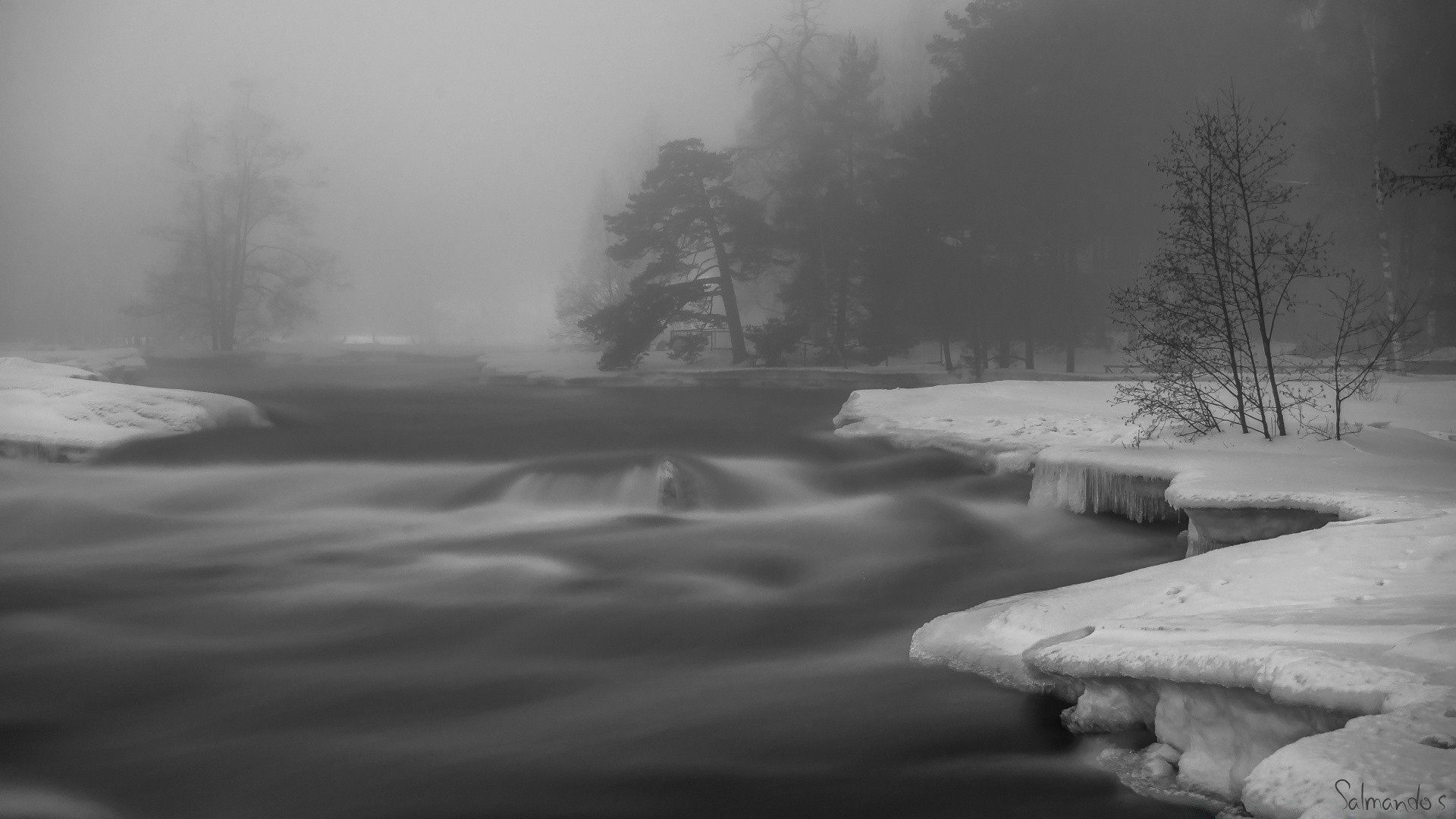 Domek nad jeziorem na tle zimowego krajobrazu i góry