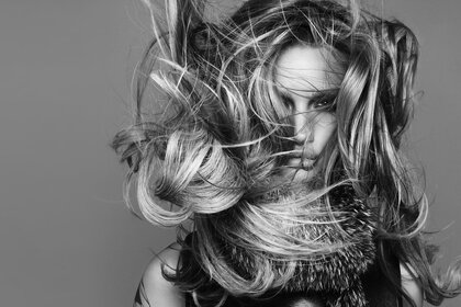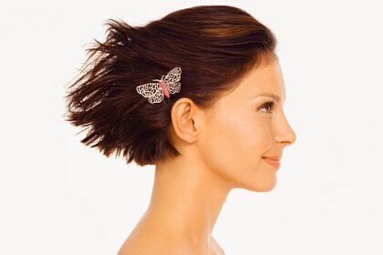 Kobieta z spinką do włosów z boku motyla uśmiecha się i patrzy w bok