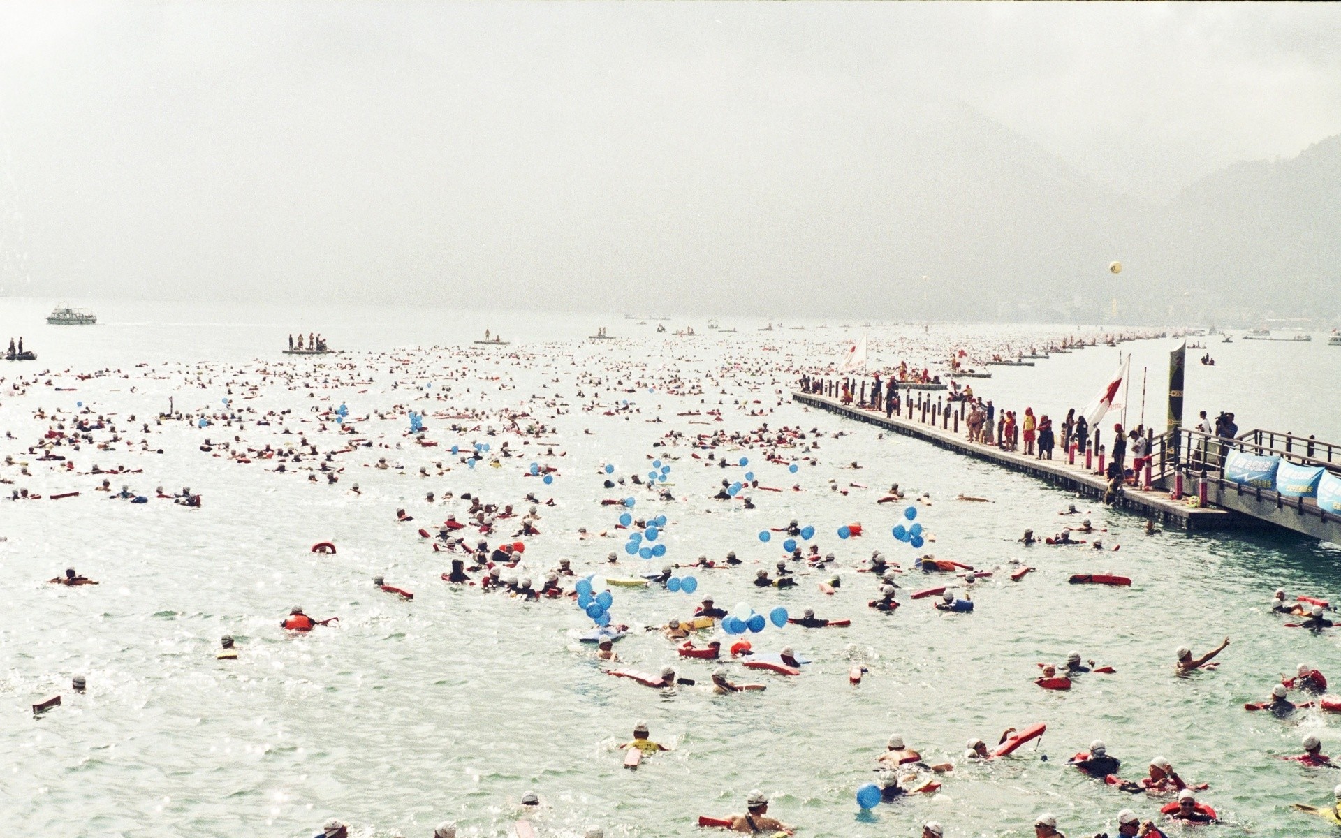 Mglisty Brzeg morza pełen ludzi