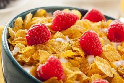 Płatki kukurydziane z malinami pyszne śniadanie jedzenie