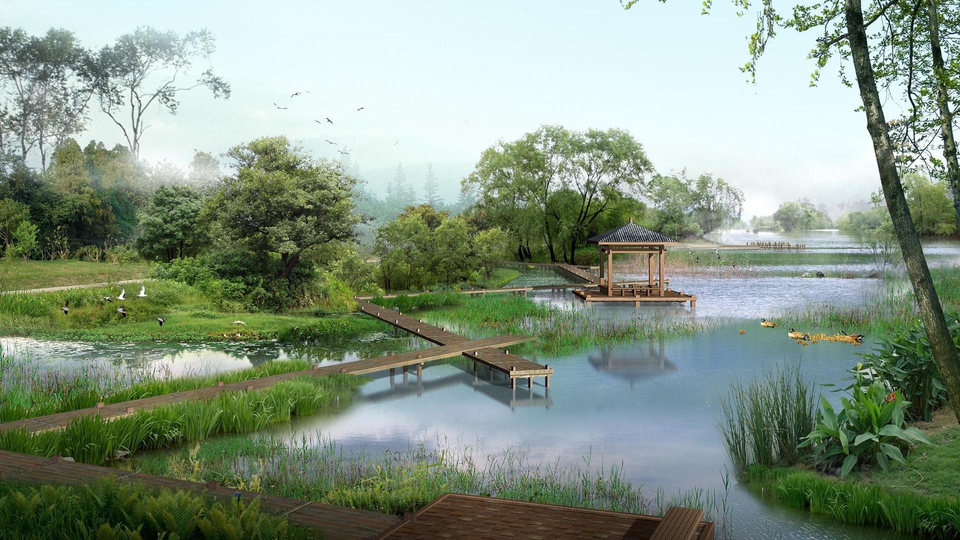 Drewniane kładki nad cichym rozlewiskiem rzeki