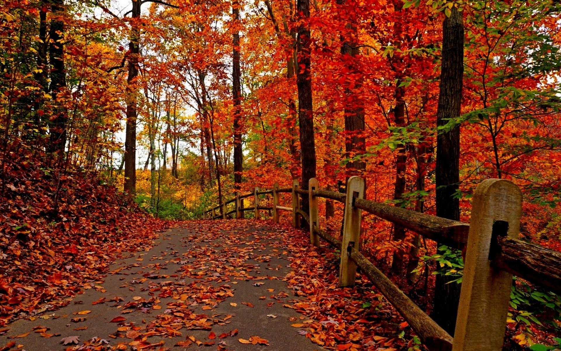 Droga z płotem w jesiennym czerwono-żółtym lesie
