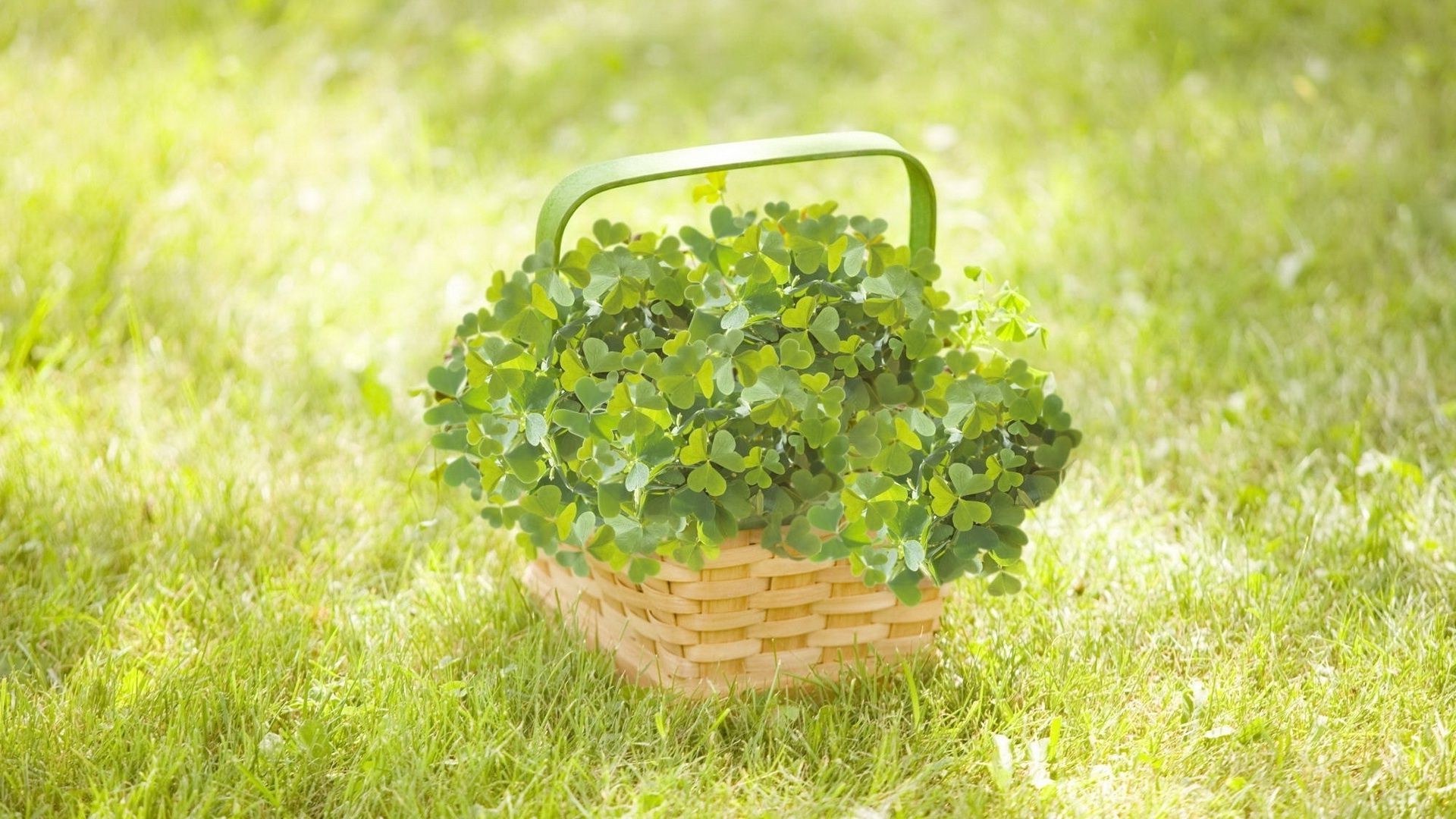 Wiklinowy kosz z zielenią na trawie. Piękny wiejski krajobraz