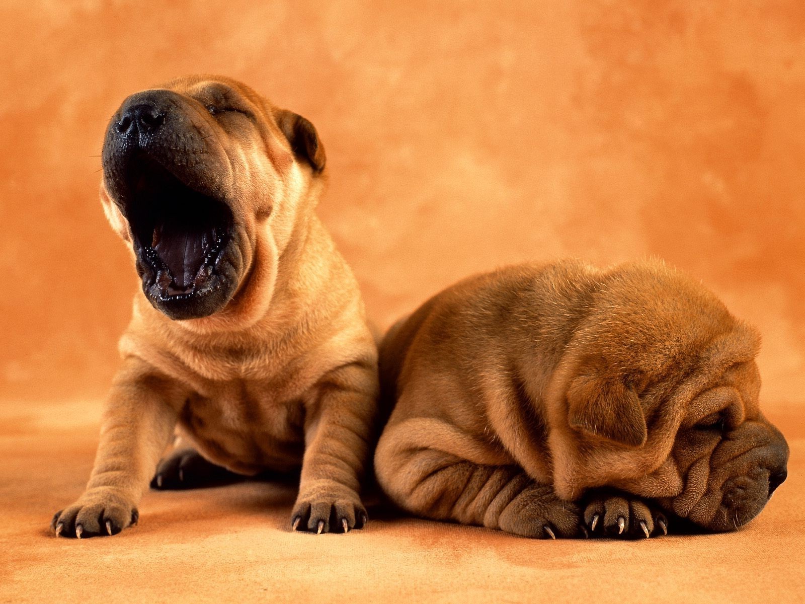 Dwa szczenięta Shar Pei, a jeden ziewa