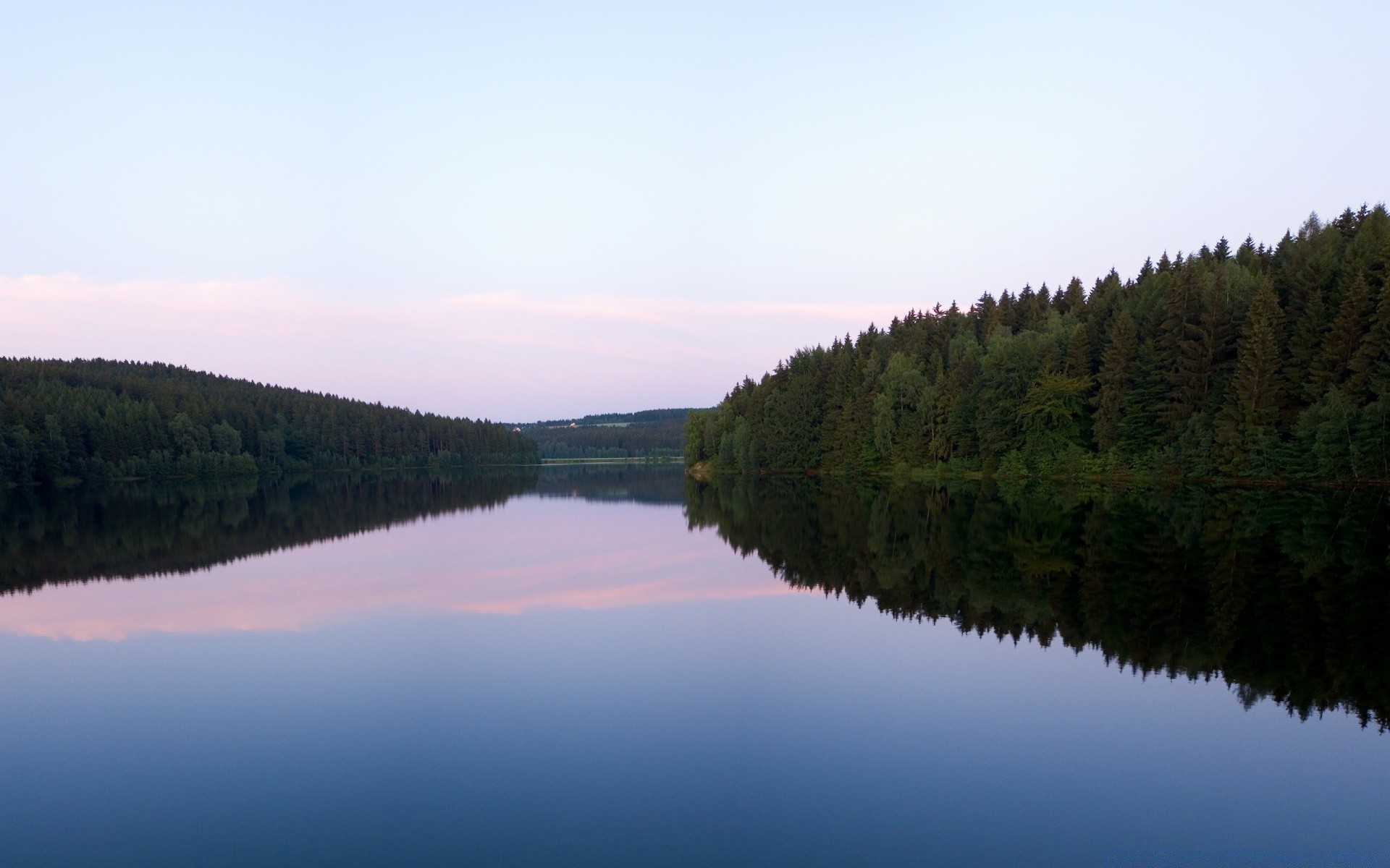 Niebieski zachód słońca nad jeziorem. Zmierzch nad wodą