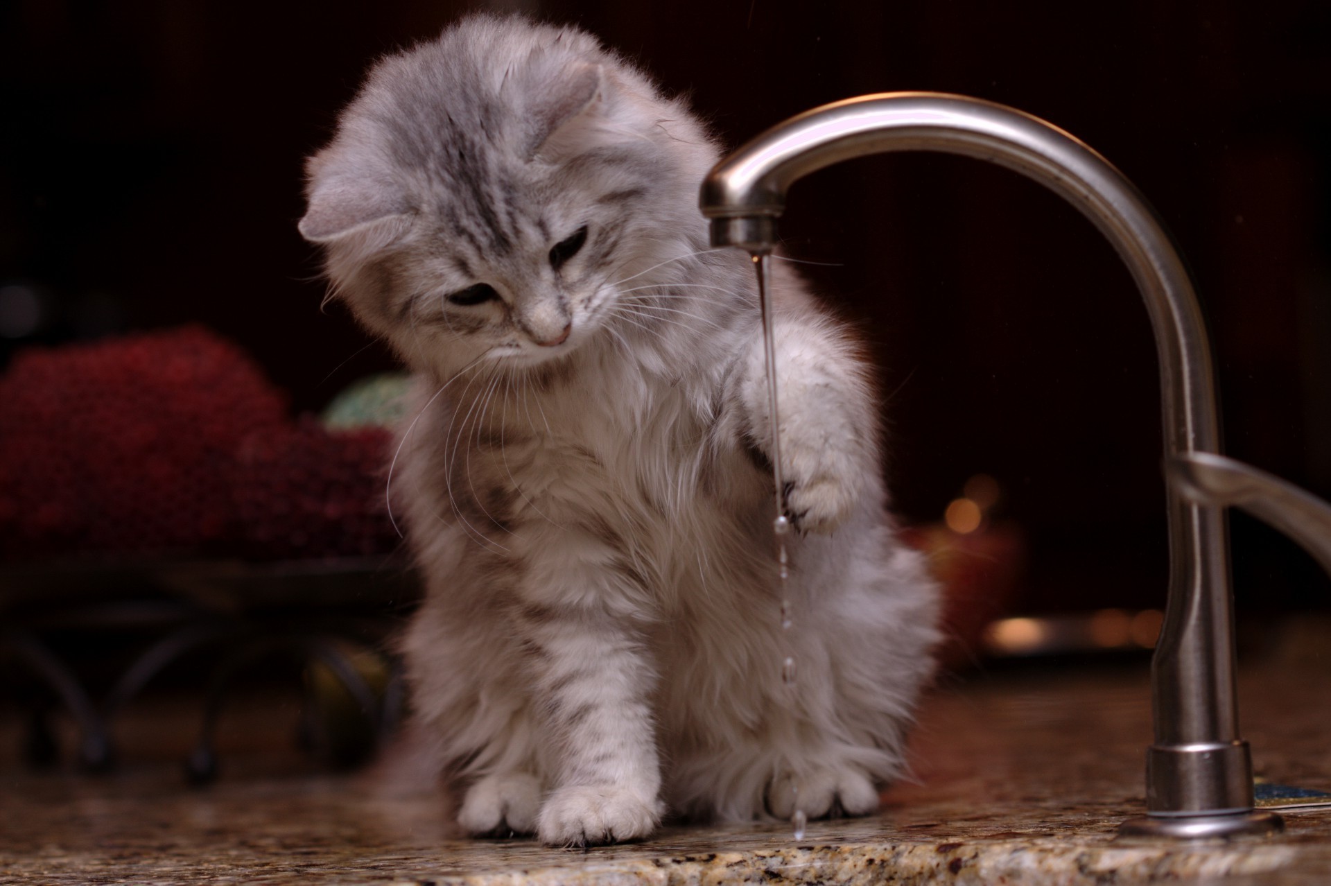 Szary kotek jak się bawi strużką wody spływającej z kranu