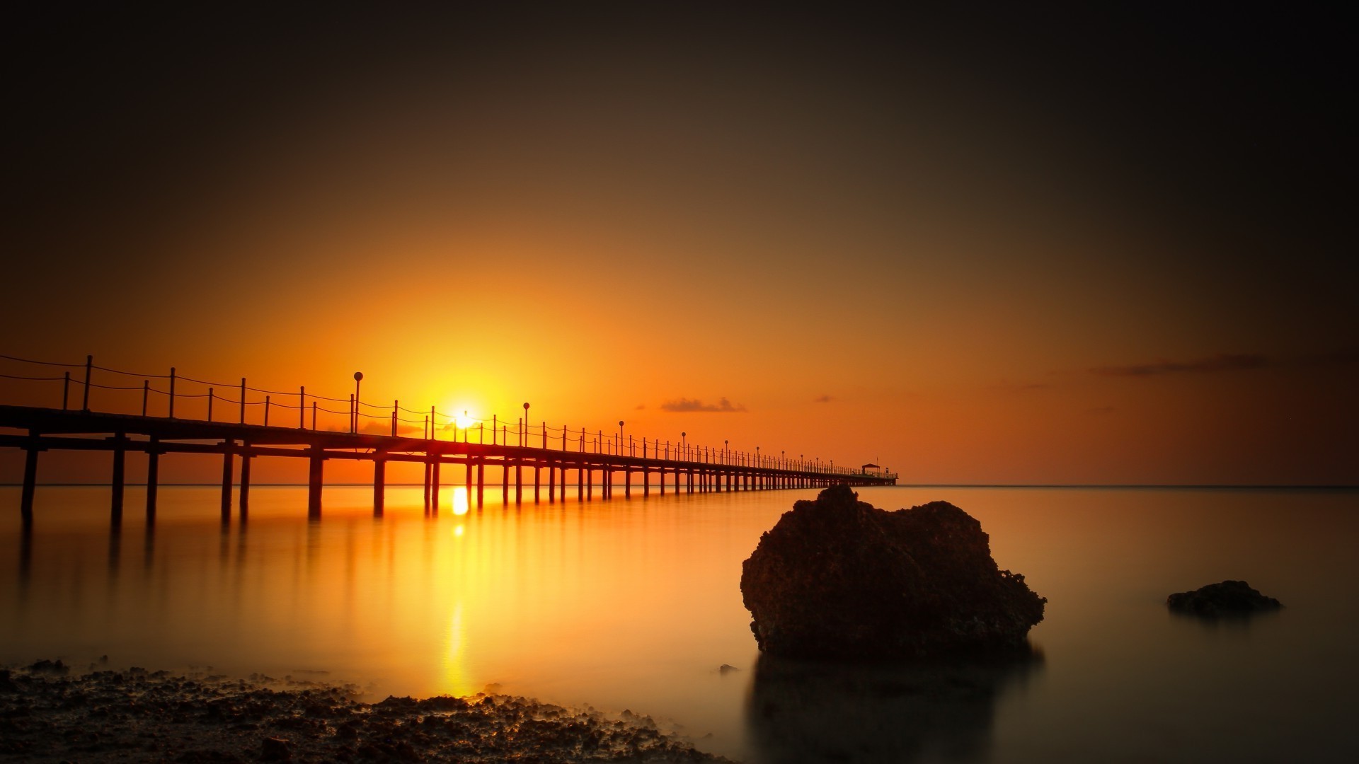 Krajobraz długiego mostu o zachodzie słońca nad powierzchnią wody
