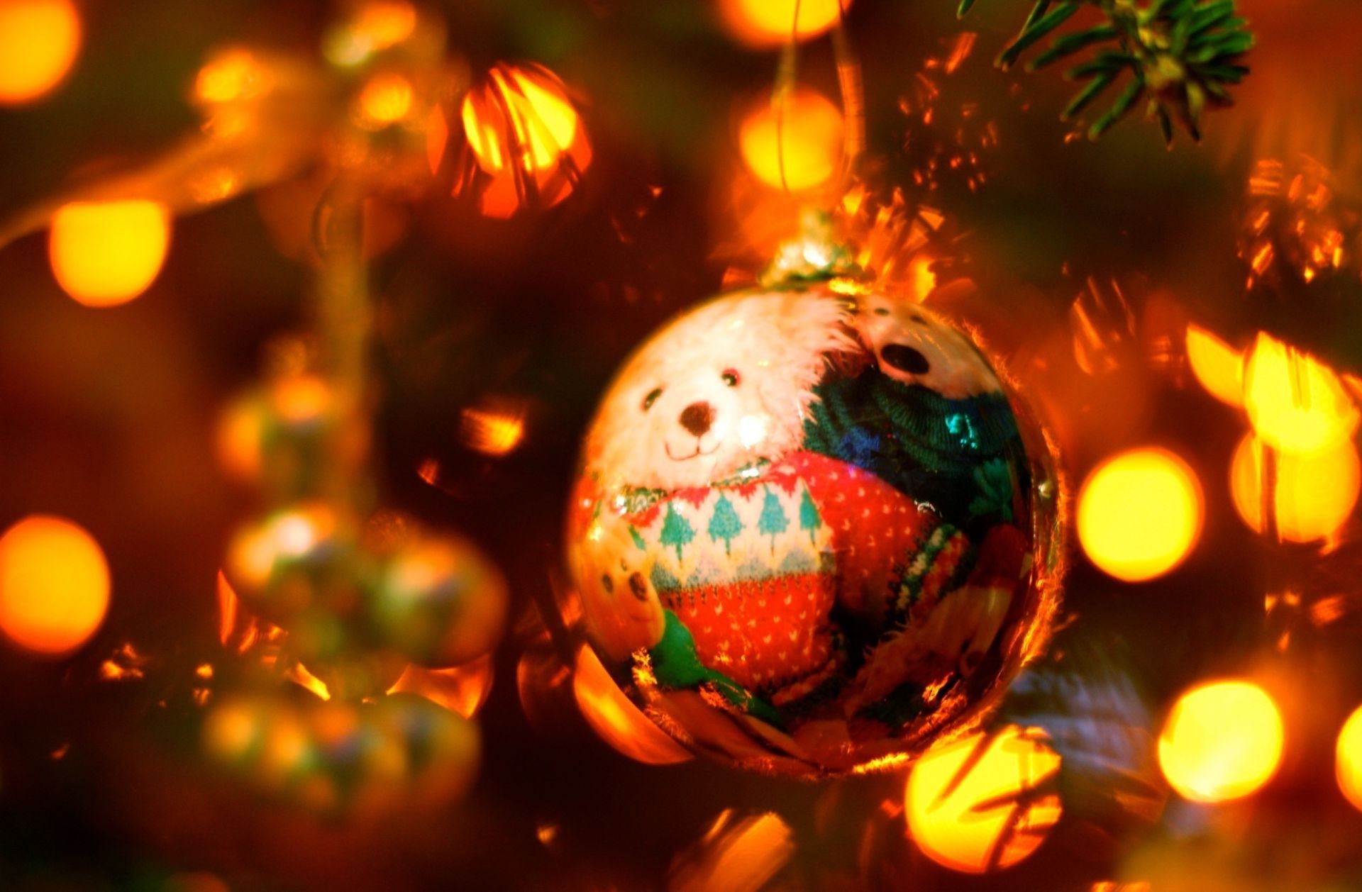 Ciepła atmosfera sylwestrowa. Zabawka świąteczny krasnal. Choinka