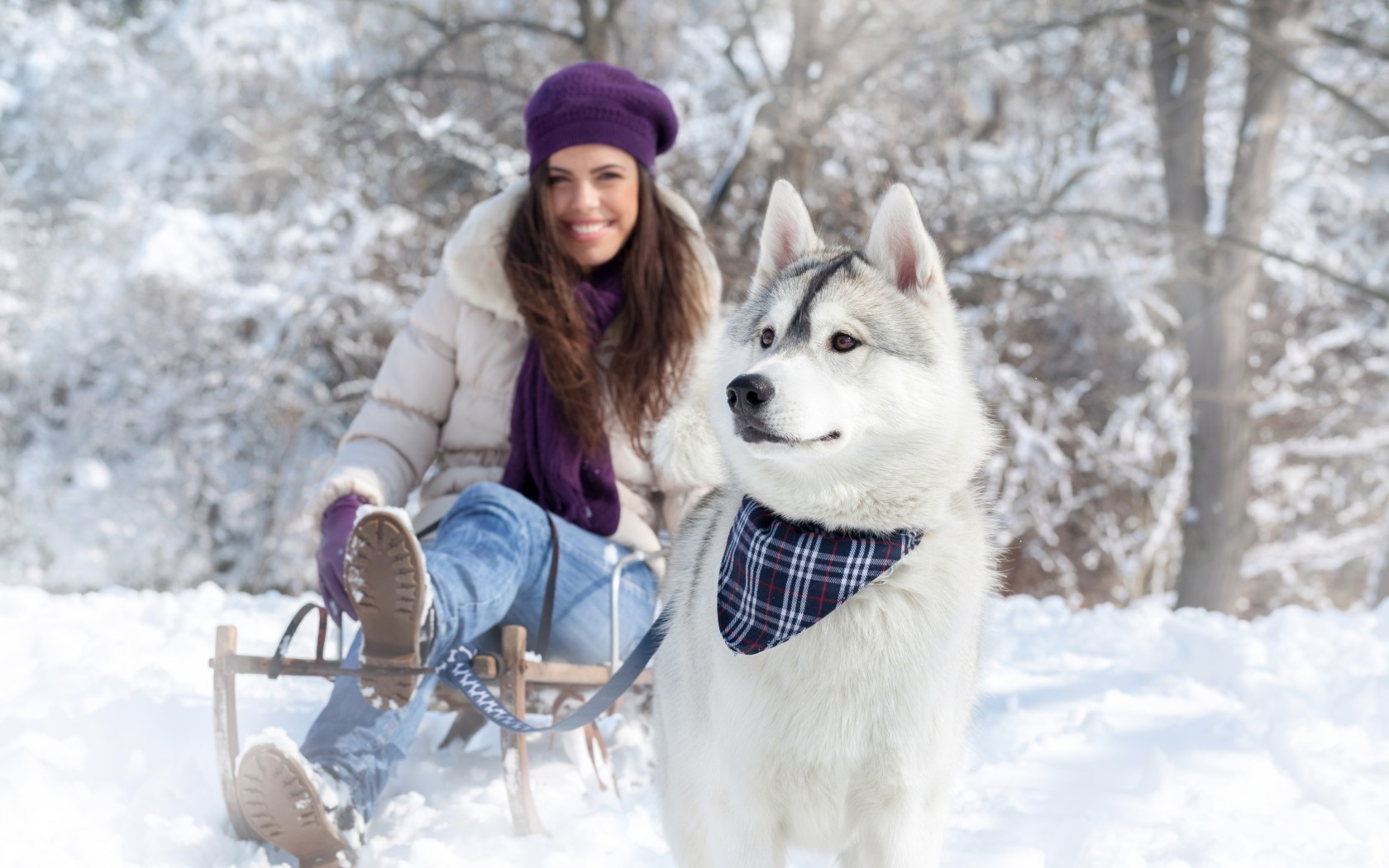 Dziewczyna na zimowym spacerze z Husky
