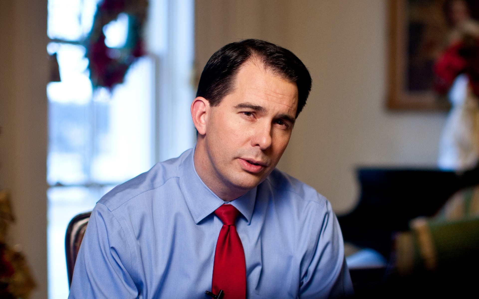 Mężczyzna w średnim wieku w czerwonym krawacie i niebieskiej koszuli