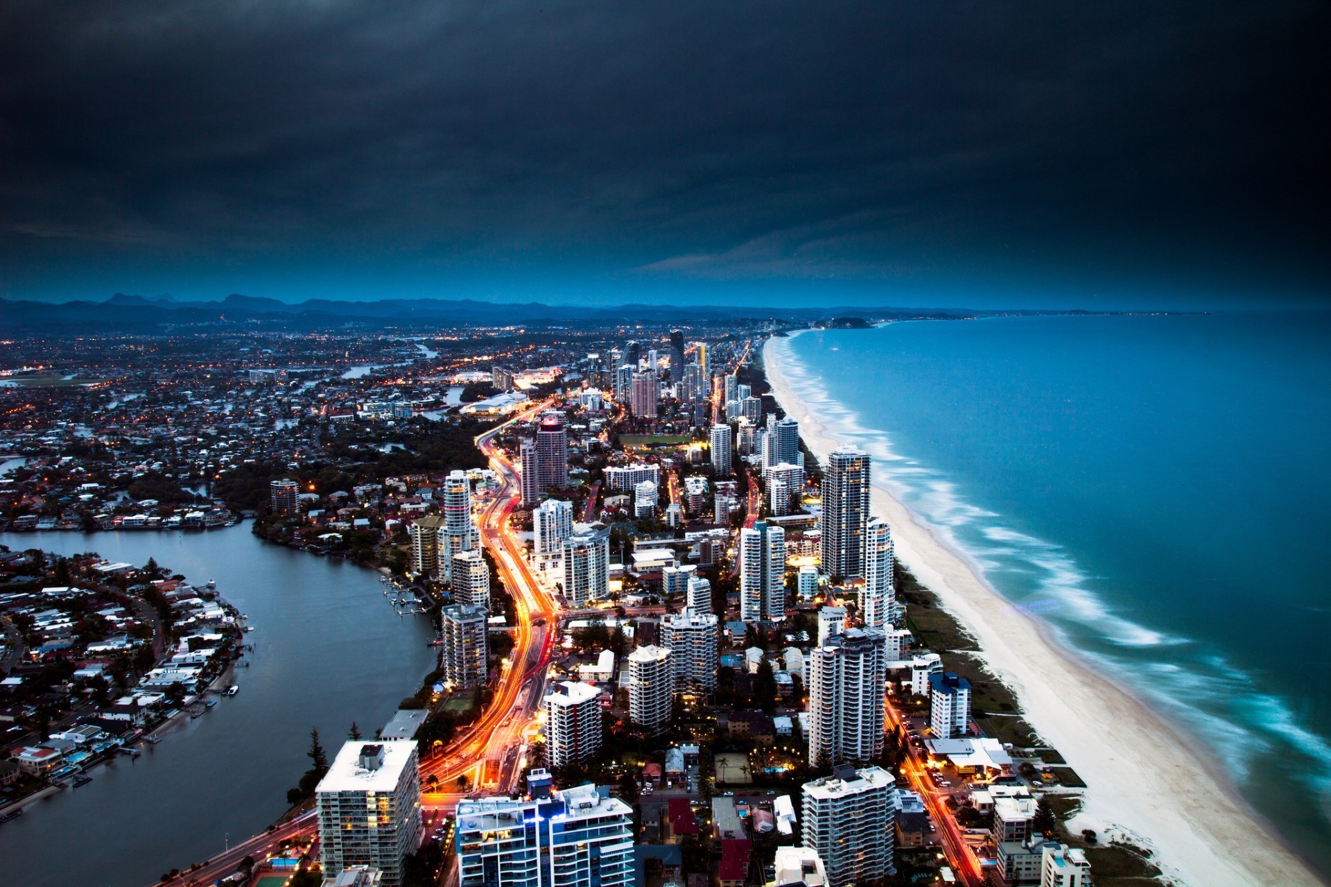 Drapacze chmur w pobliżu brzegu morza