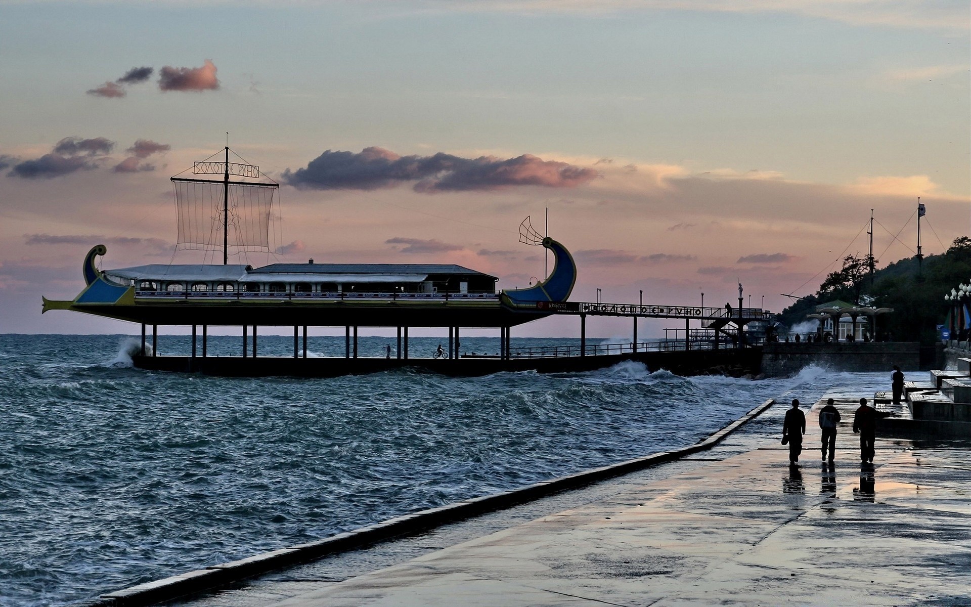 Ciężkie jednostki pływające na tle zachodu Słońca