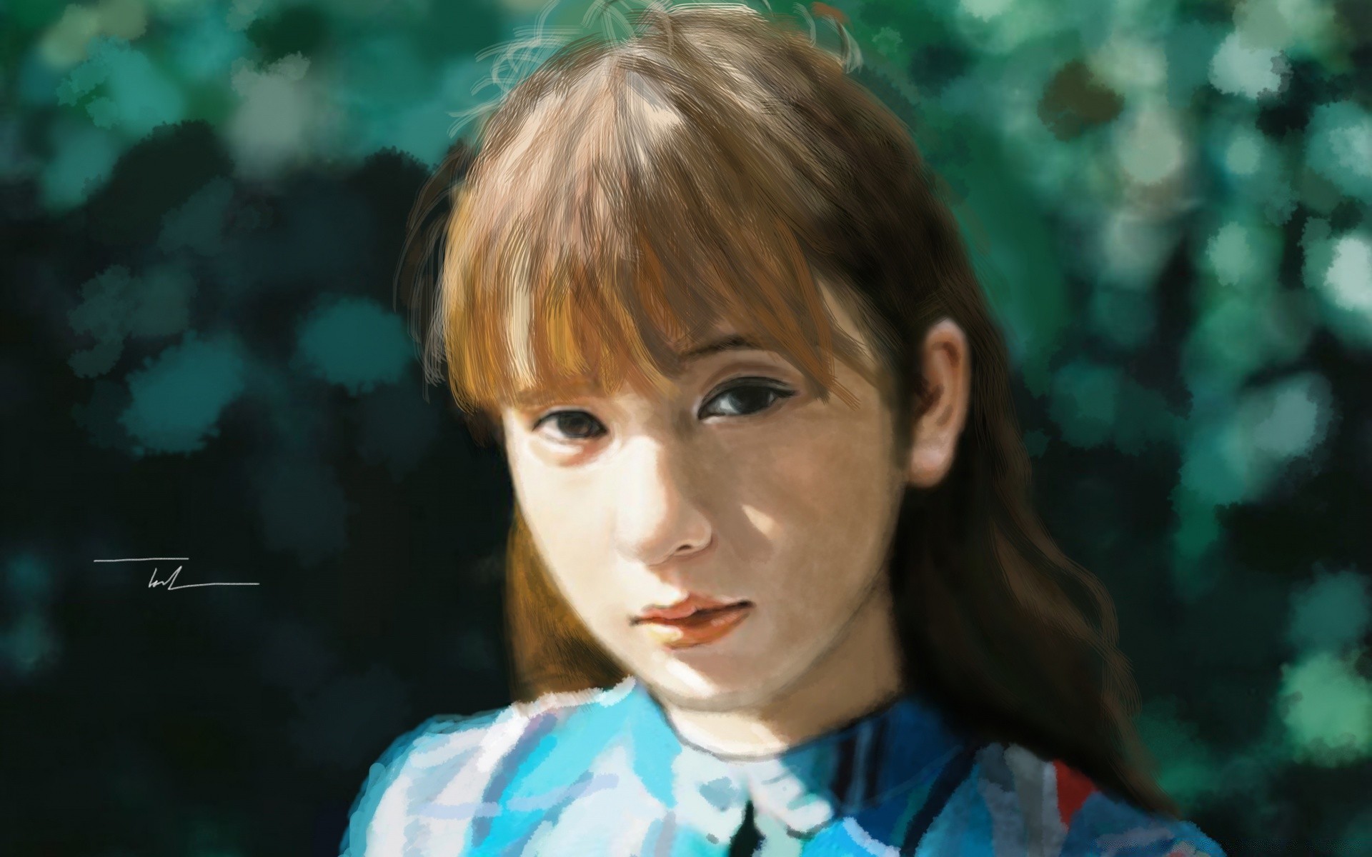 Rysunek portret dziecko dziewczyna na ciemnozielonym słonecznym tle