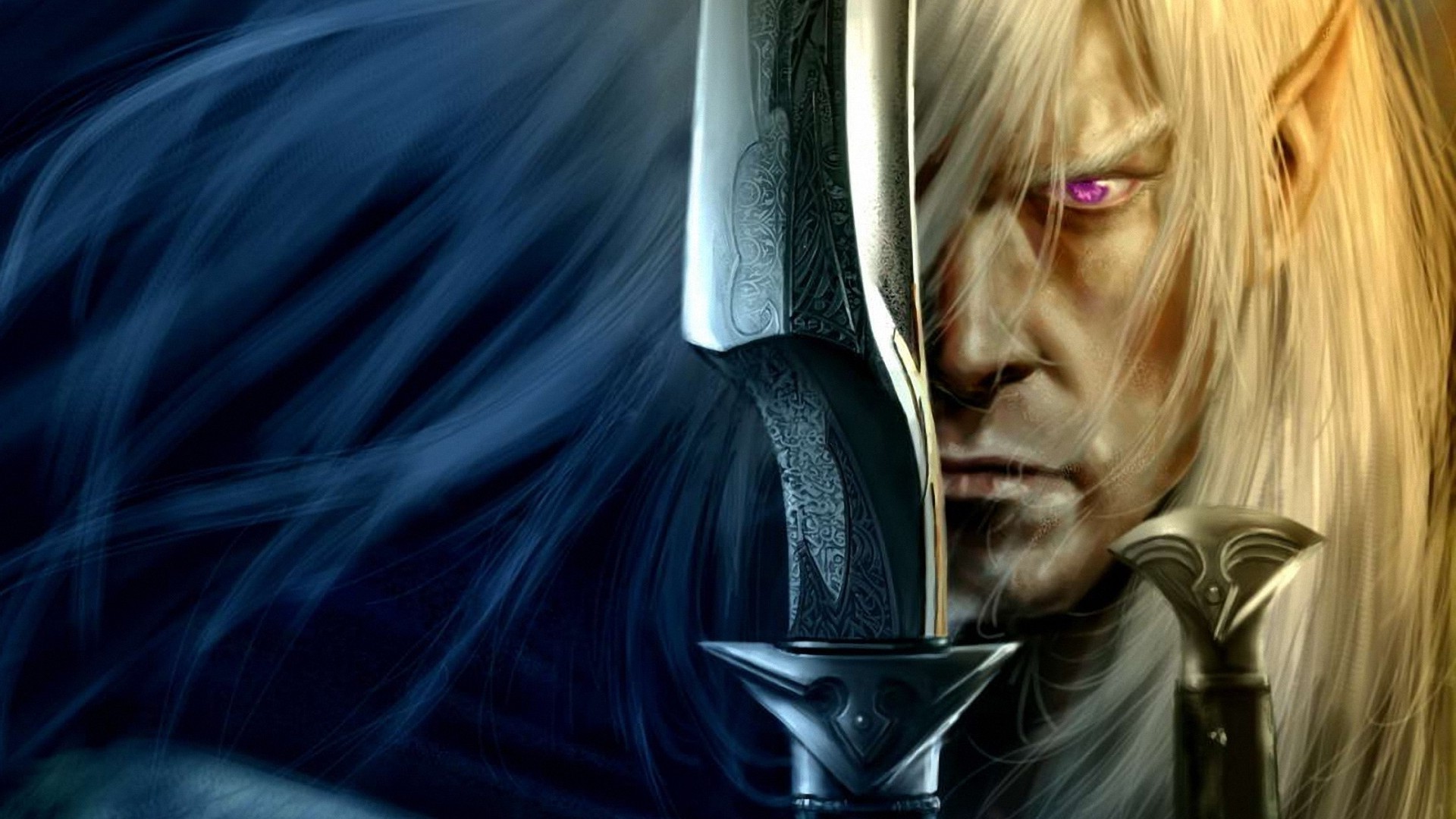 Elf biały portret z mieczem na ciemnym tle