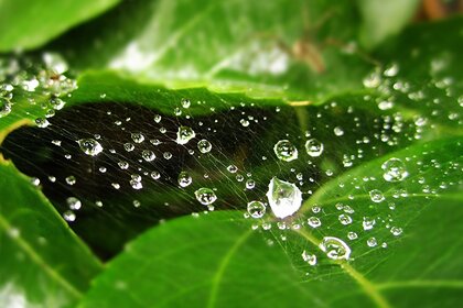 Wiele kropli rosy spada na liście