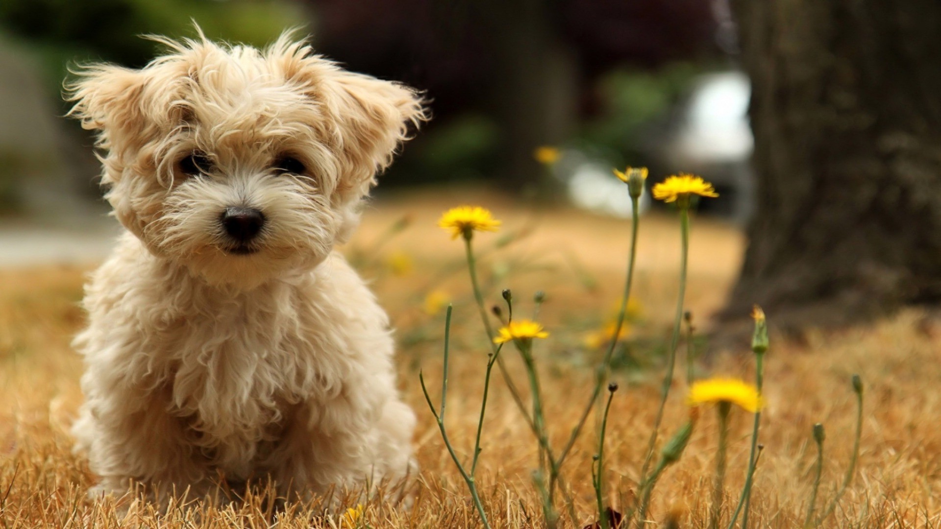 Szczeniak na szarej trawie wpatruje się w obiekt