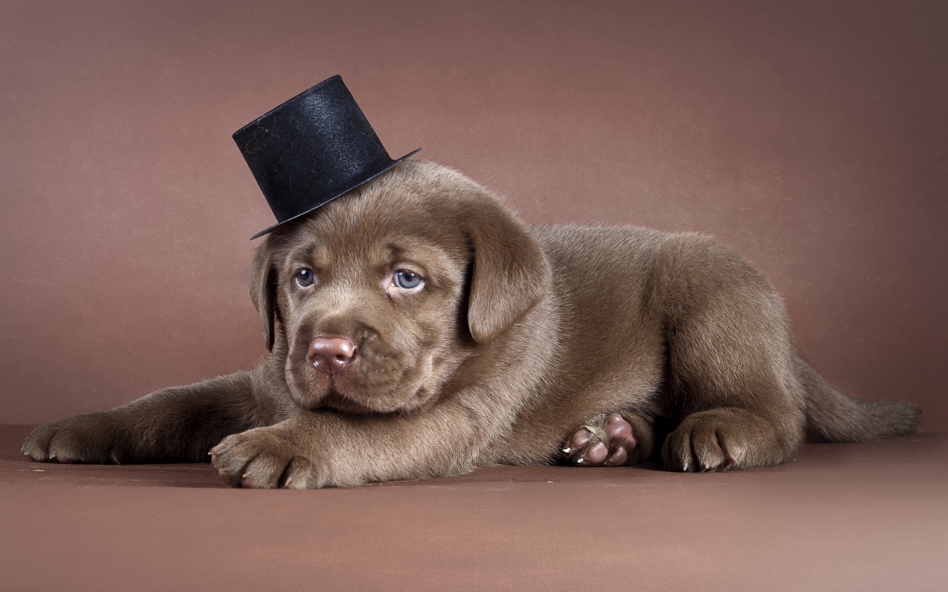 Czekoladowy szczeniak labradora w czarnym cylindrze