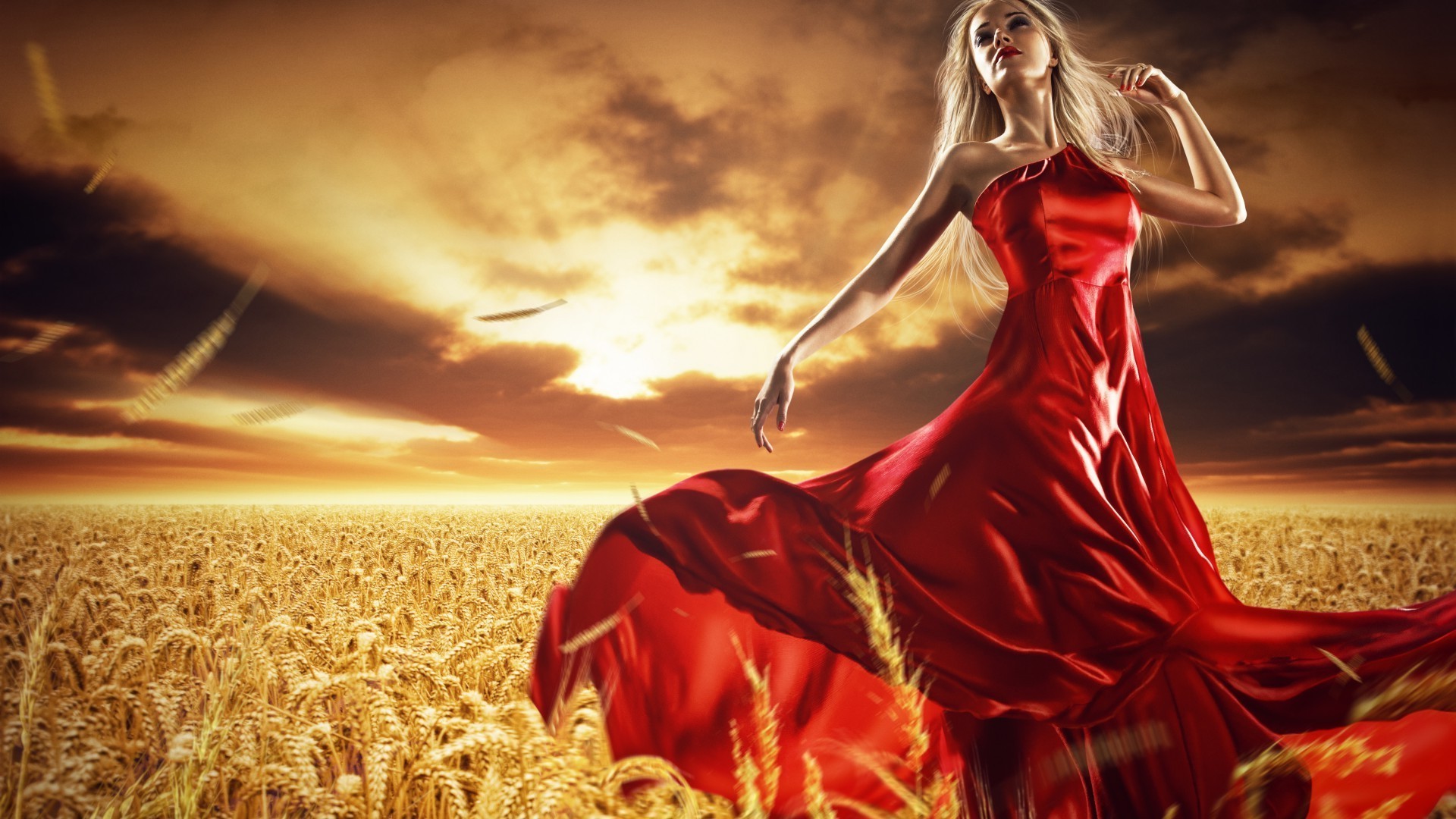 Dziewczyna w czerwonej sukience na polu pszenicy