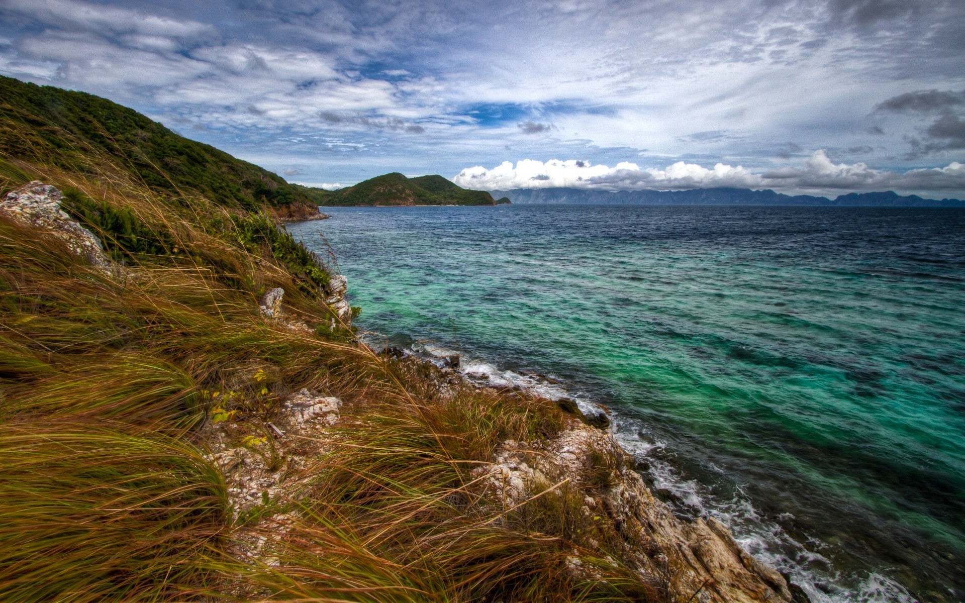 Wiatr wygina trawę nad brzegiem morza