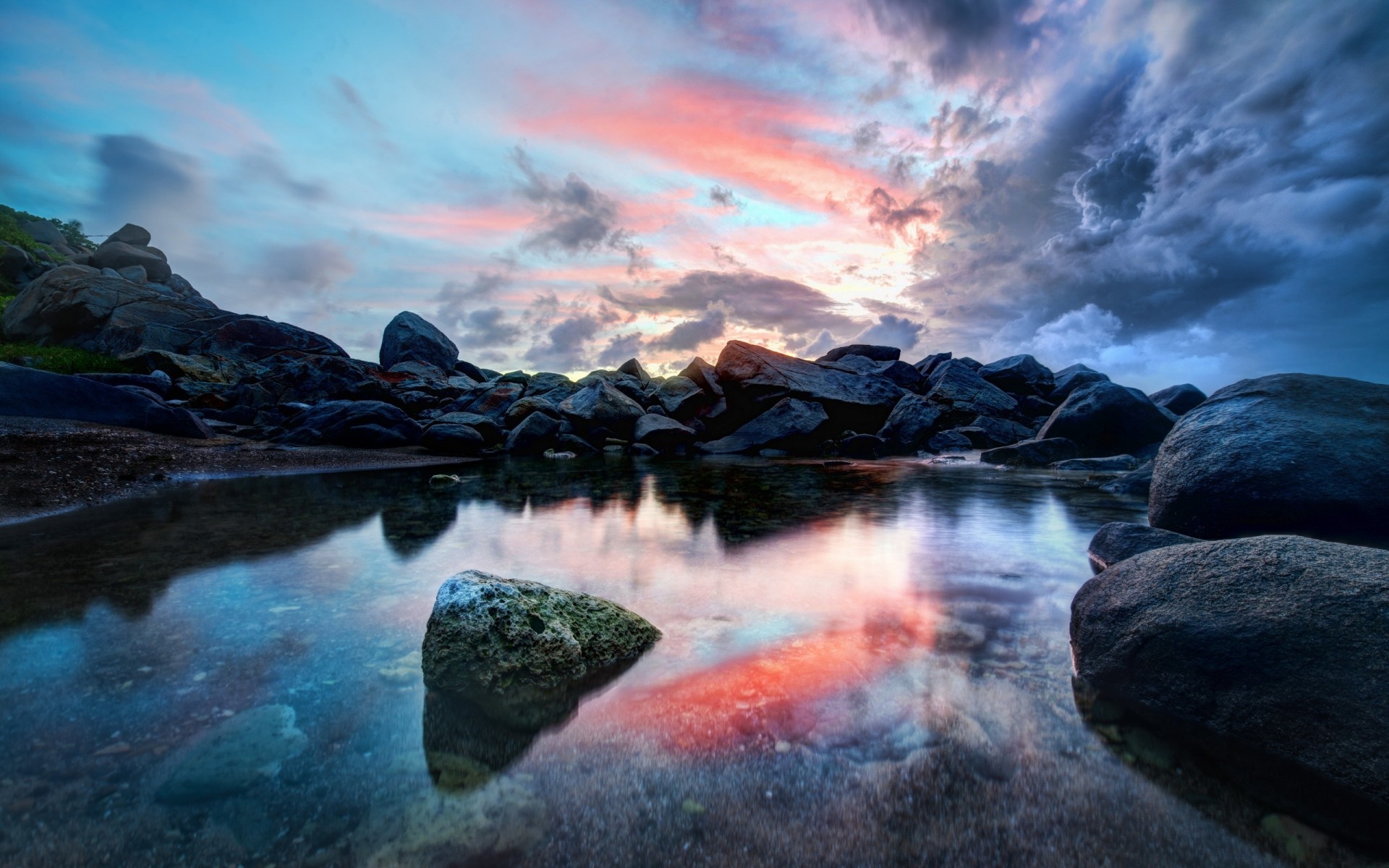 Fale morskie rozbijają się o skały o zachodzie słońca