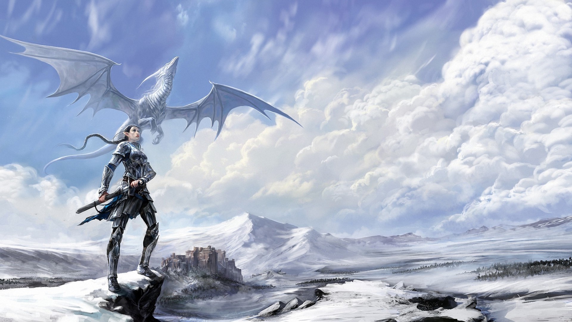Wojownicza dziewczyna na tle unoszącego się Smoka