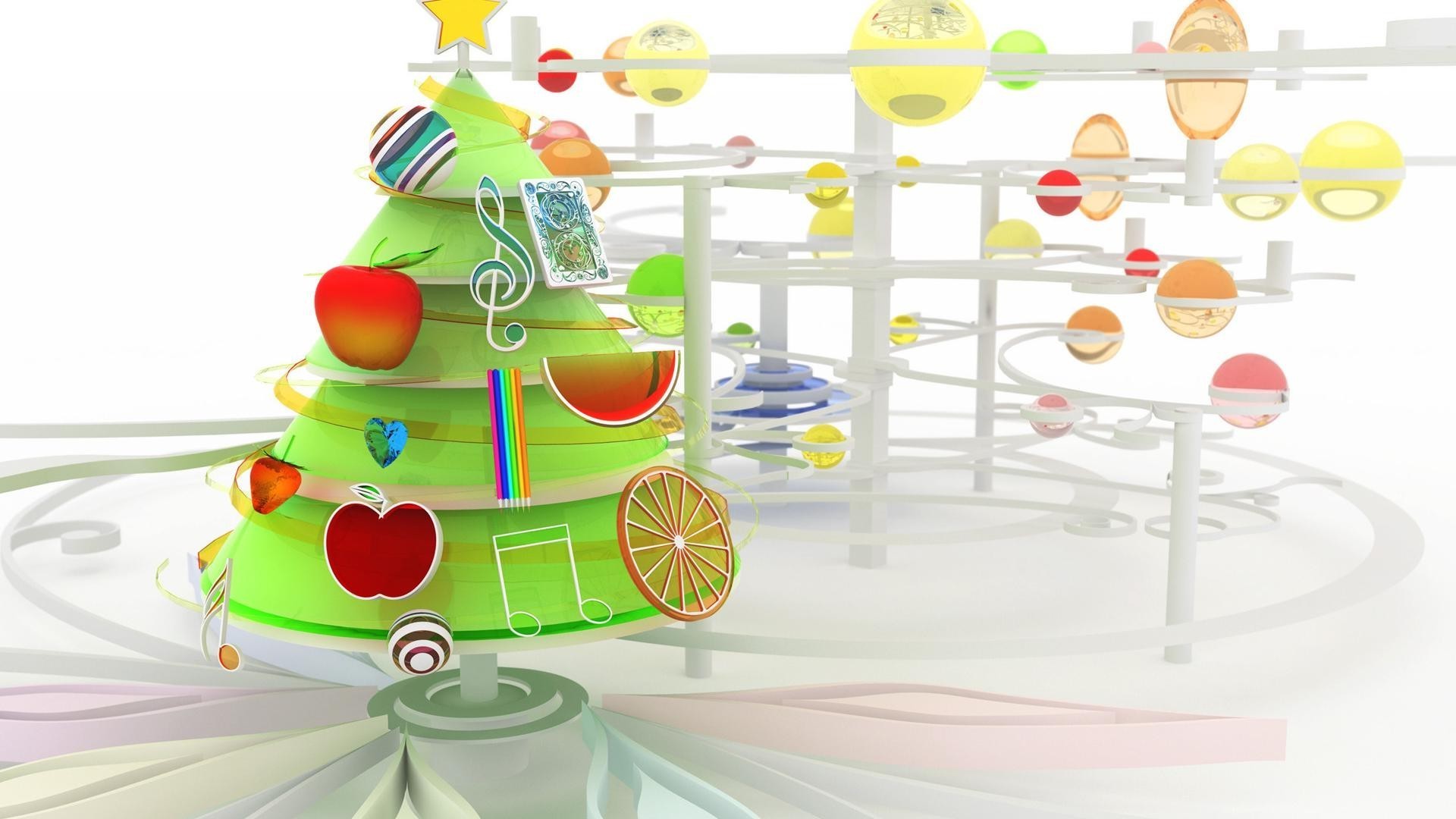 Choinka z prezentami. Święty Mikołaj w zaprzęgu z reniferami przynosi prezenty