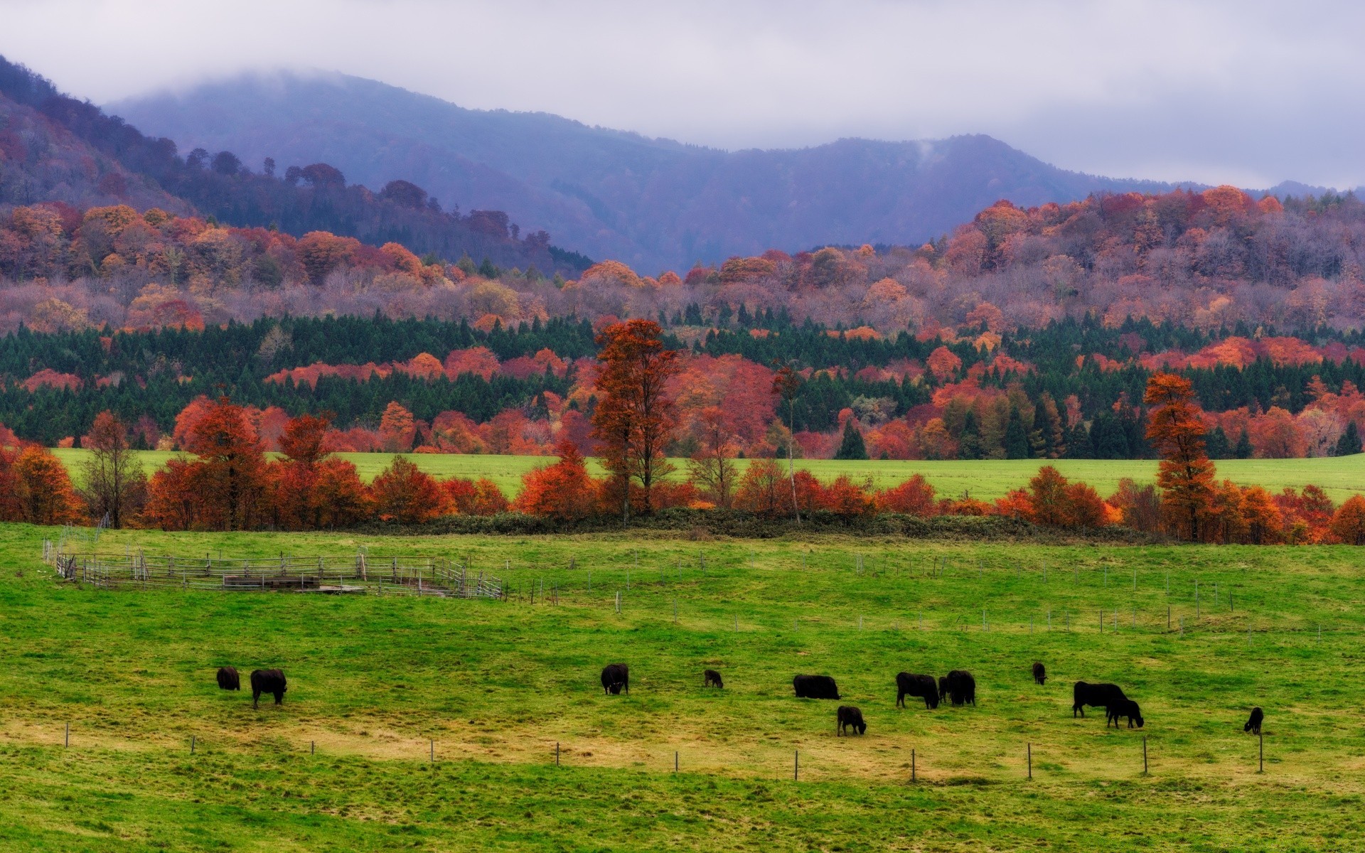 Obraz zielonego lasu izosh, na którym znajduje się trawa górska i Dom