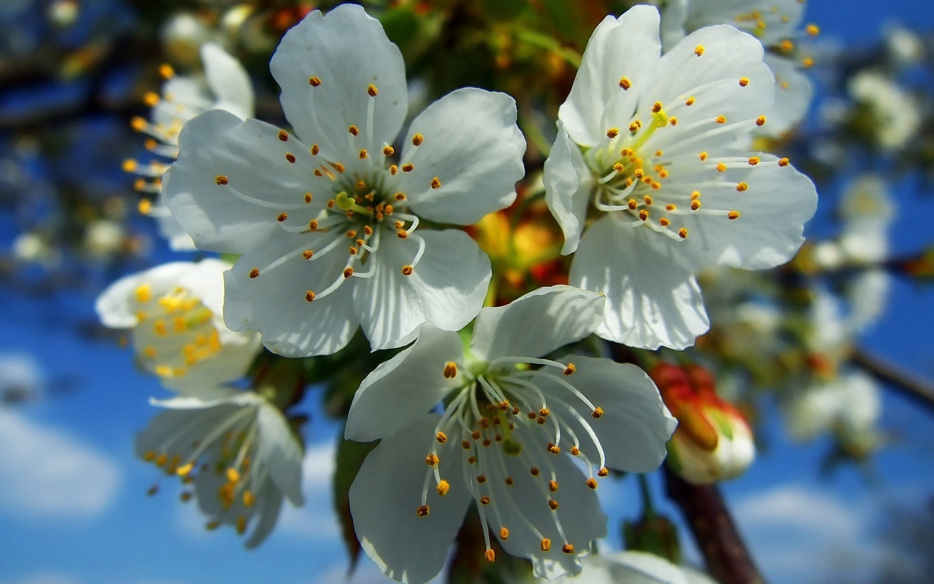 Białe kwiaty z pięcioma płatkami trzy kwiaty na pierwszym planie rozmyte tło w tle błękitne niebo z chmuramiBiałe kwiaty z pięcioma płatkami trzy kwiaty na pierwszym planie rozmyte tło w tle błękitne niebo z chmurami