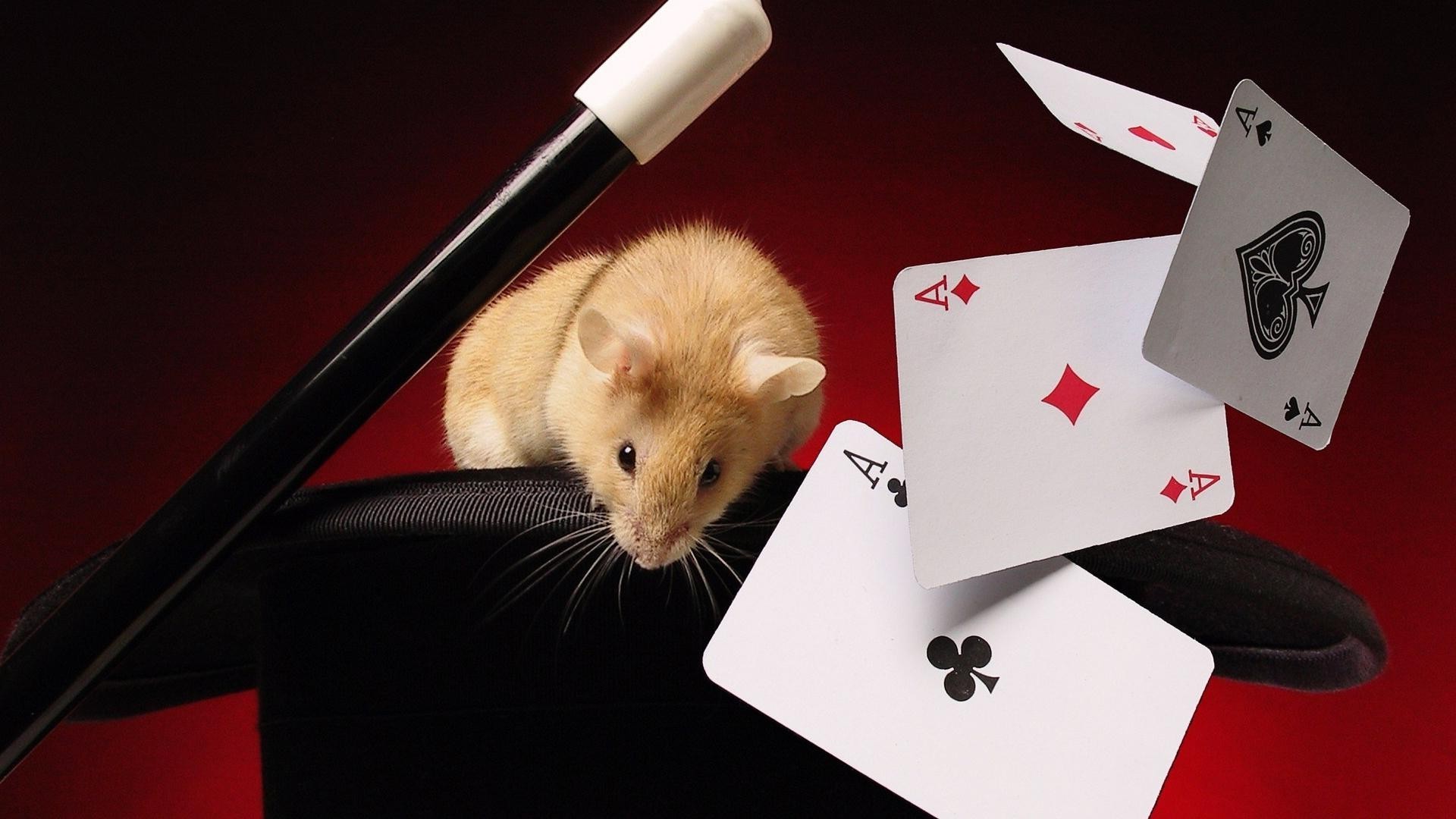 Mysz siedzi na kapeluszu z kartami do gry