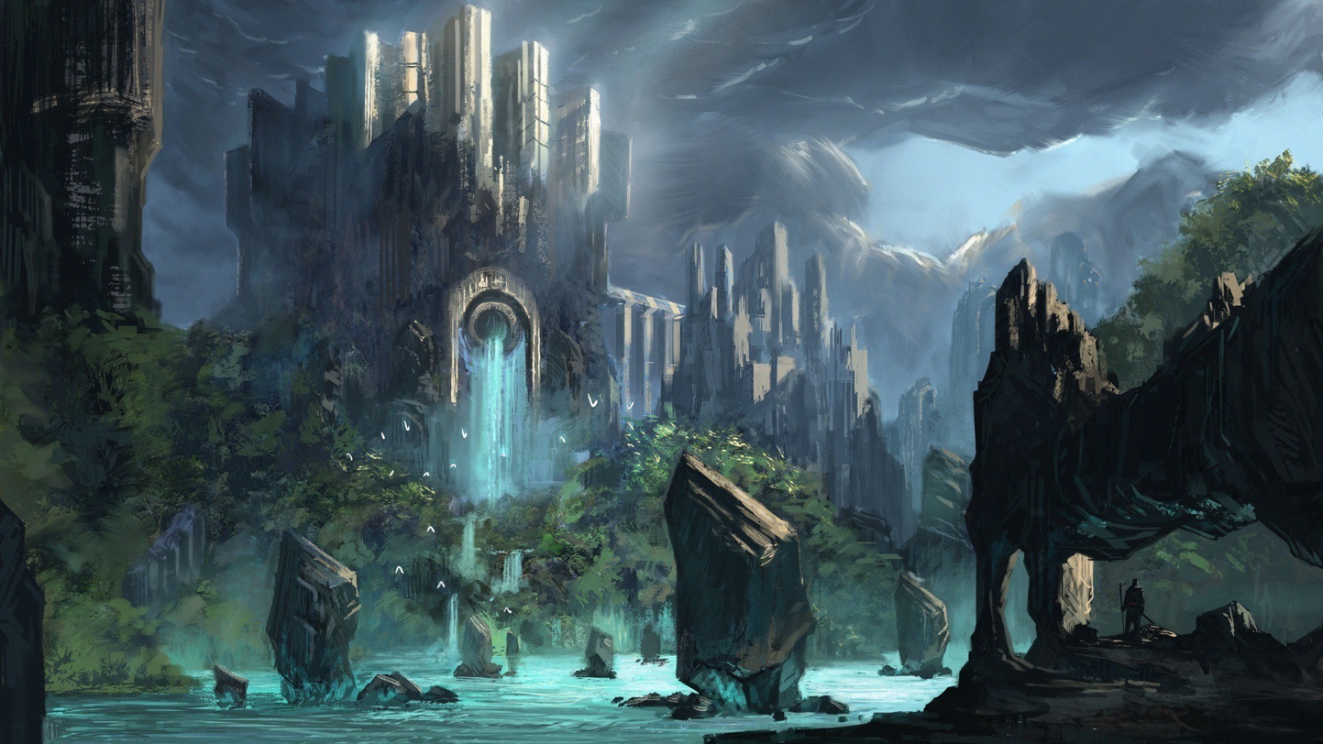 Jasne Wieczorne miasto nad wodą. Z eleganckimi budynkami