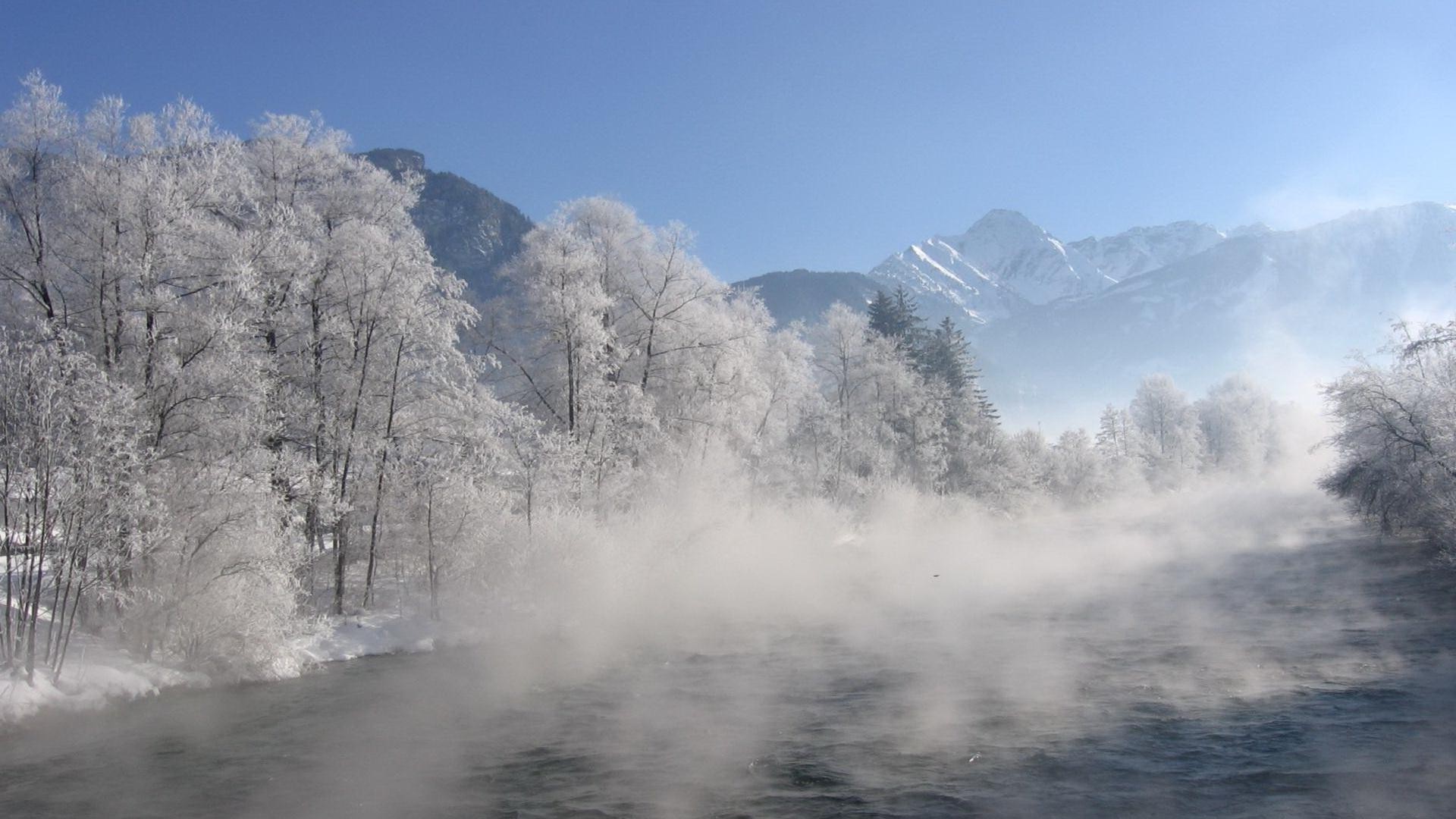 Mgła nad zimową górską rzeką