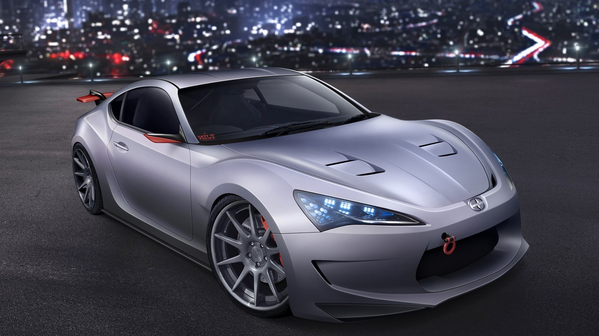 Srebrny samochód sportowy stoi na drodze wśród zielonych wzgórz