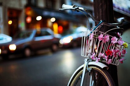 Wieczorne miasto. Samochody i rower