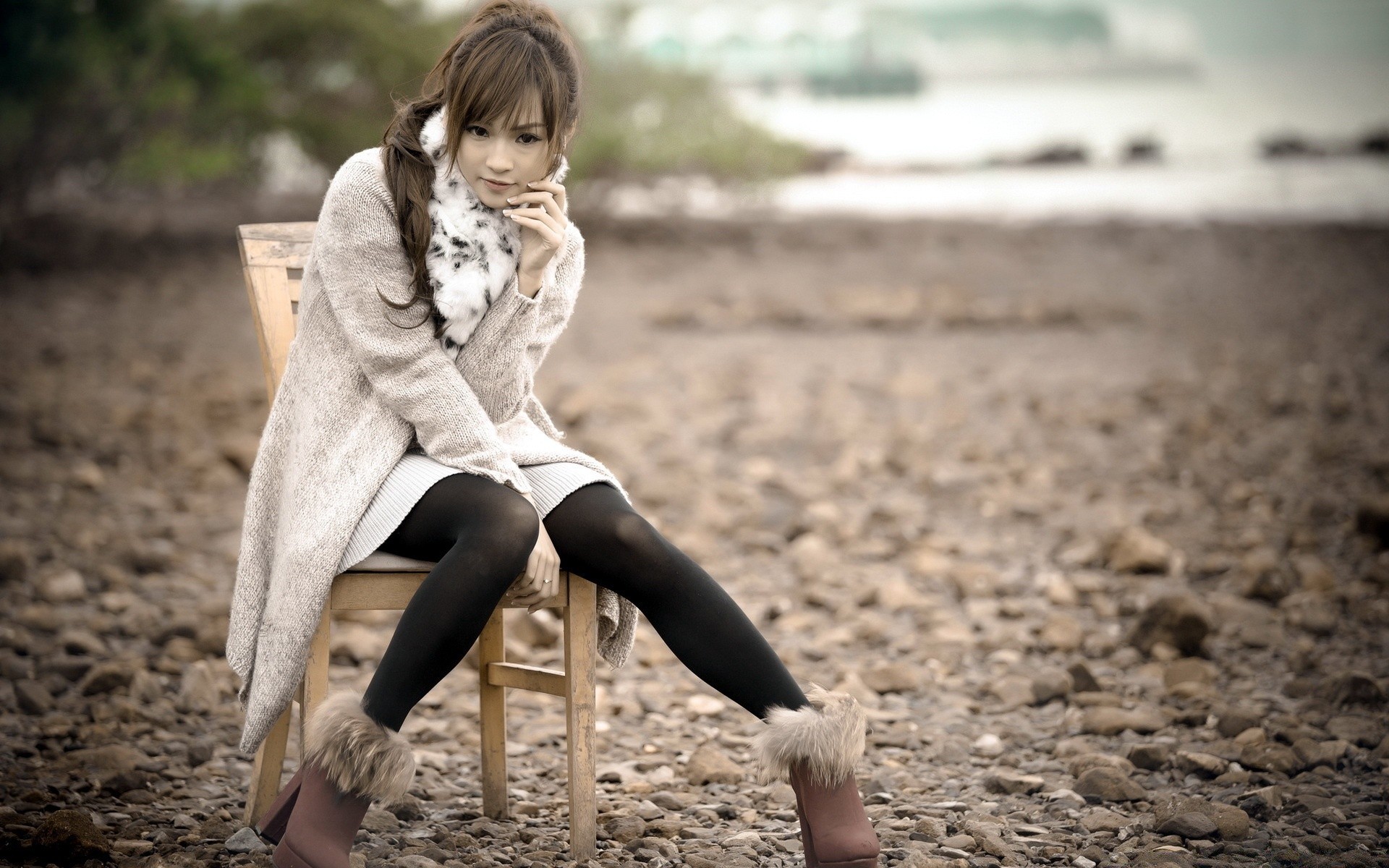 Dziewczyna siedzi na krześle w pobliżu oceanu