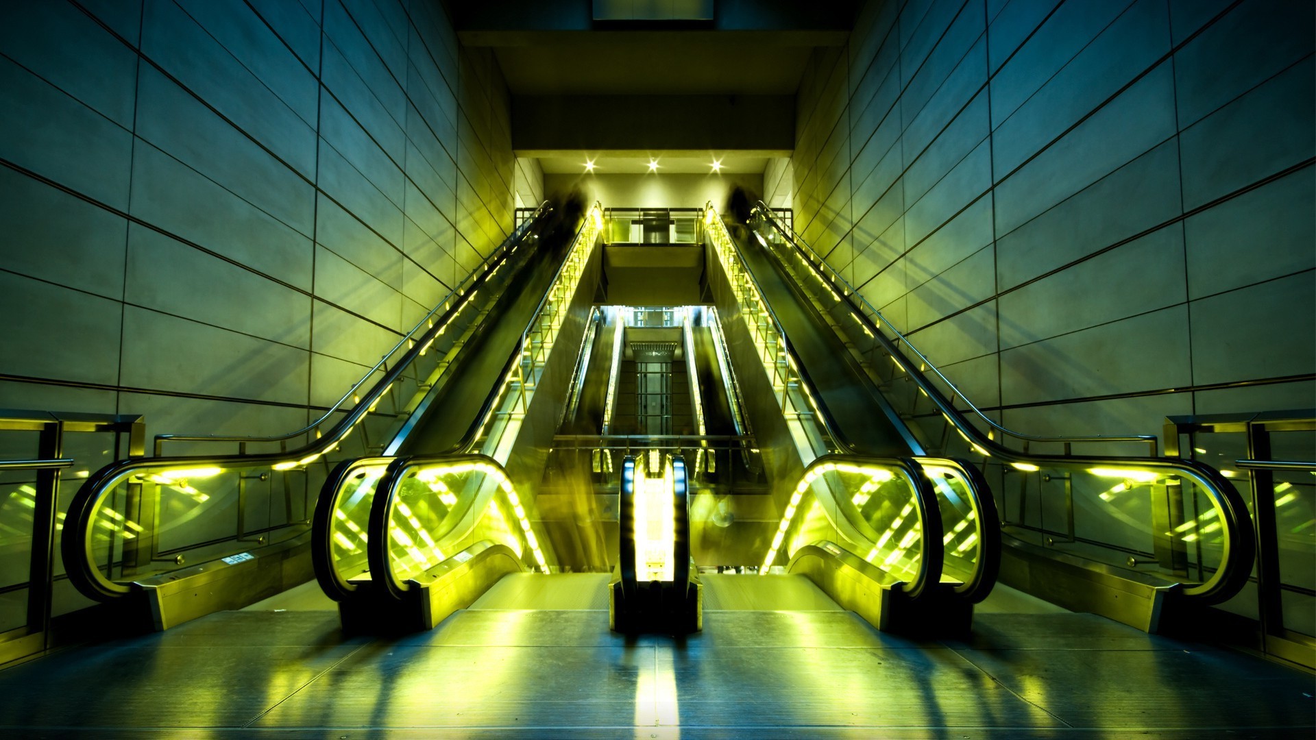 Miejskie schody ruchome w żółtym oświetleniu