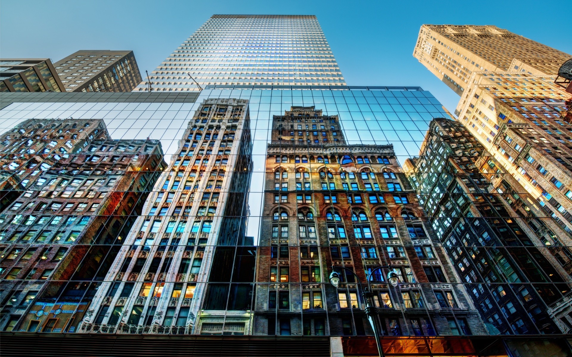 Architektura miejska odbita od lustrzanych ścian wieżowca